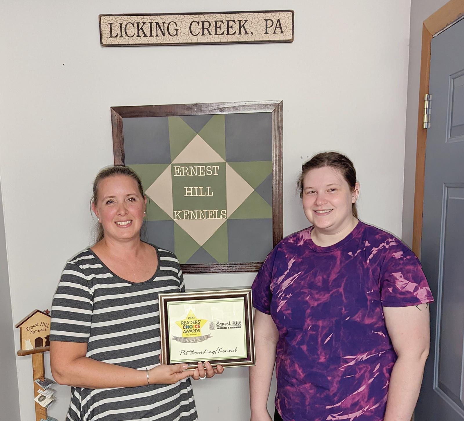 Rylan Bargo, owner of Ernest Hill Kennels, pictured on the left and groomer Corrine Lawhorn on the right, display the award for being a Finalist in the Pet Boarding/Kennel cate gory for The Sentinel 2022 Readers’ Choice survey.