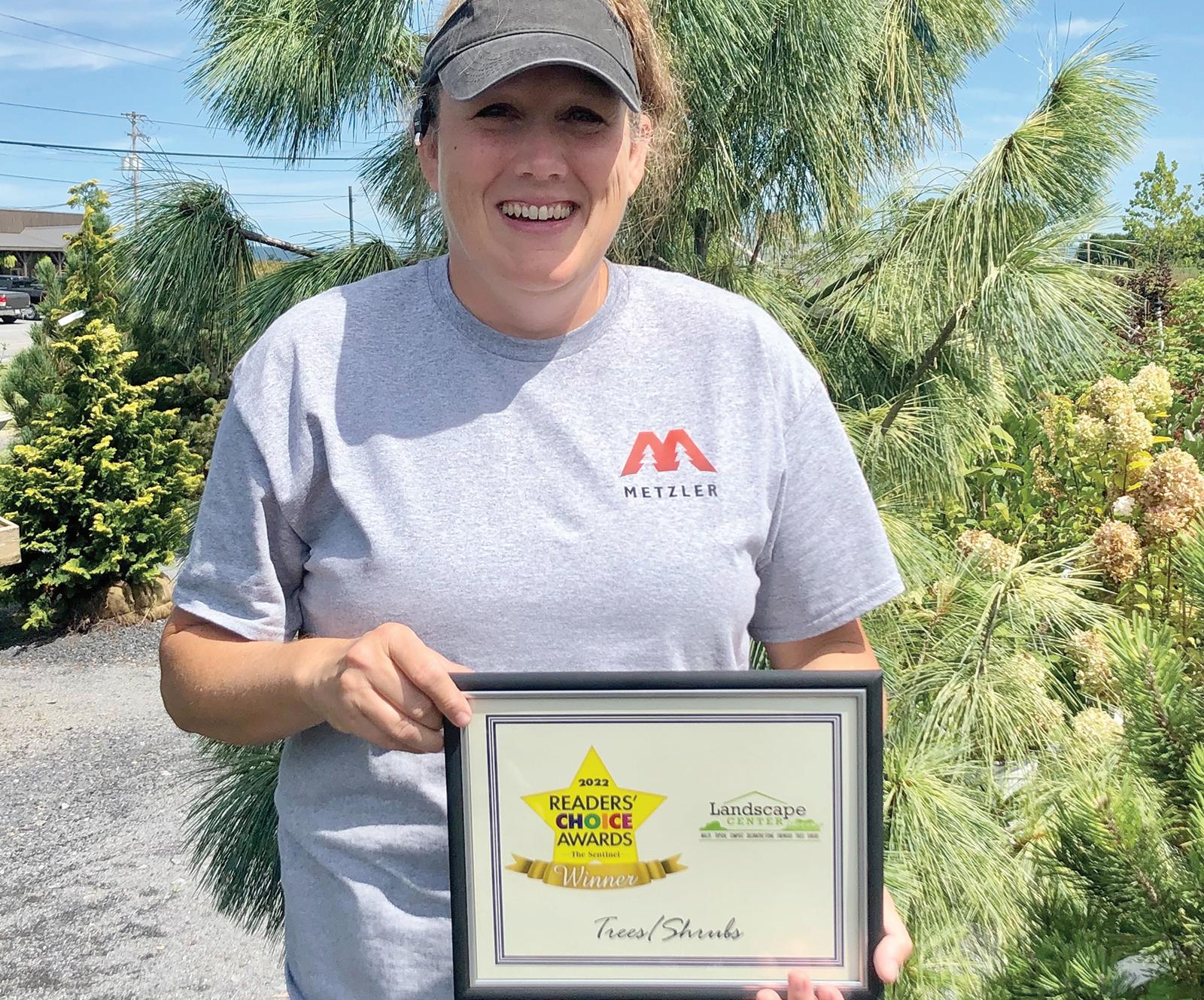 Christine Shenk, manager of the Metzler Landscape Center, holds the award for Favorite Trees/Shrubs in the 2022 Sentinel Readers’ Choice survey.