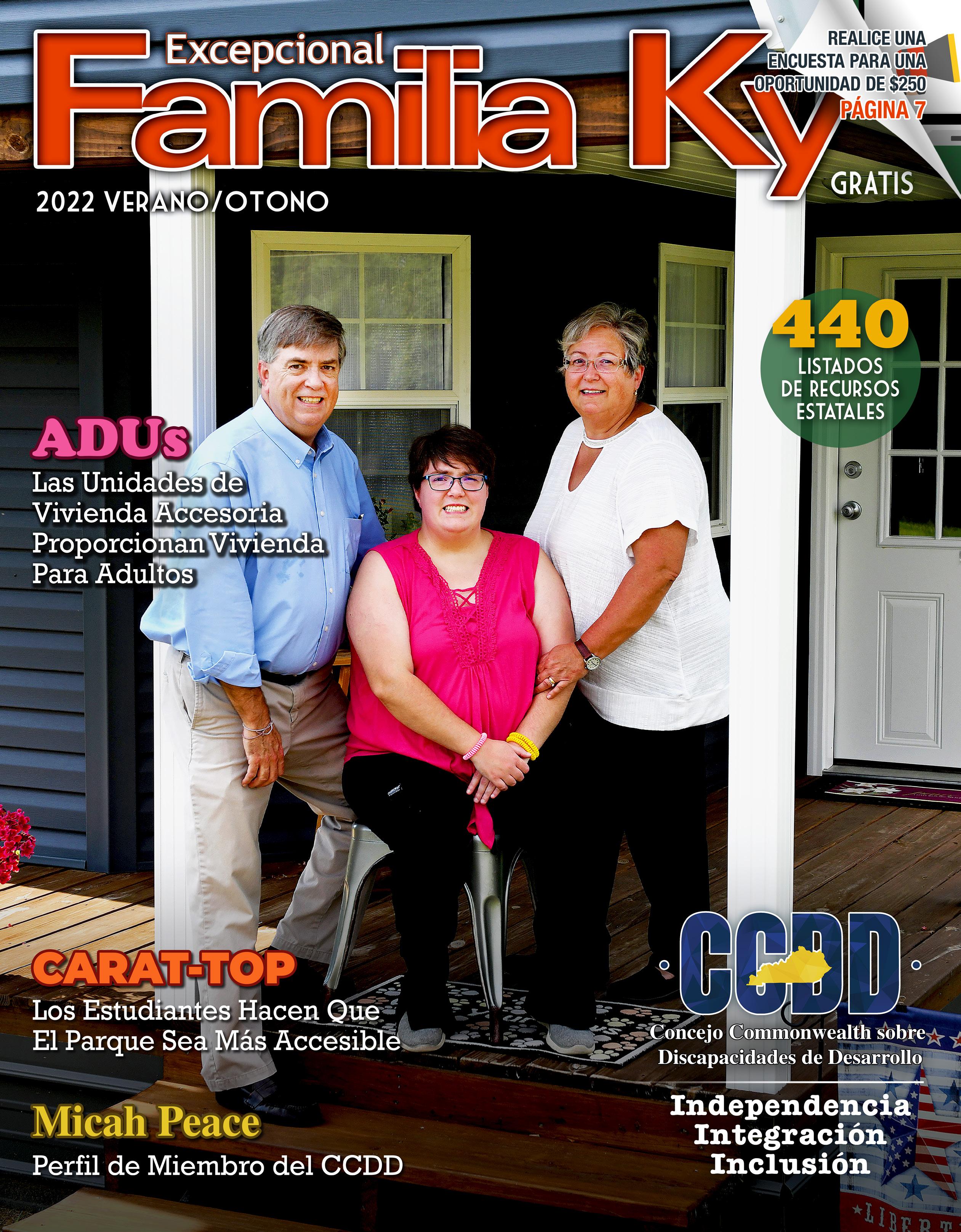 Independencia Integración Inclusión 2022 VERANO/OTOÑO 12 Los ADUs Funcionan Vida Independiente para Adultos con Discapacidades 14 Perfil de Miembro del CCDD Construyendo Puentes con un Defensor Interdisciplinario 4 Carta de CCDD Grant Gupton Mantiene un Estilo de Vida Dinámico 6-9 Noticias del CCDD Nuevas Oficinas, Nuevos Funcionarios, Nuevos Miembros 16 Lista de Recursos de A a Z Lista Estatal Proporciona Información Crucial10 Programa CARAT-TOP en Hazard Los Estudiantes Hacen que el Parque Local Sea Más Accesible Artículos de Fondo La defensa funciona En La Portada: Sarah Hitchcock del Condado Rowan está flanqueada por sus padres, Paul y Becky, frente a la casa de Sarah, una unidad de vivienda accesoria. (Por favor, vea la historia, página 12). / Foro de la Universidad Estatal de Morehead por Tim Holbrook 2 www.lexingtonfamily.com 2022 “Excepcional Familia KY” es publicado por Commonwealth Council on Developmental Disabilities 1024 Capital Center Dr., Frankfort, Kentucky 40601 (502) 564-7841 • www.CCDD.KY.gov Editor.....................................John Lynch Artista Grafico........................Nick Farr (859) 494-1140 / johnplynch1950@gmail.com ¿Necesita Más Copias? Para obtener copias gratuitas, llame al (859) 223-1765 o mande un correo electrónico a johnplynch1950@gmail,com ¿Hablas Espanol? For Para la versión en español, visite lexingtonfamily.com