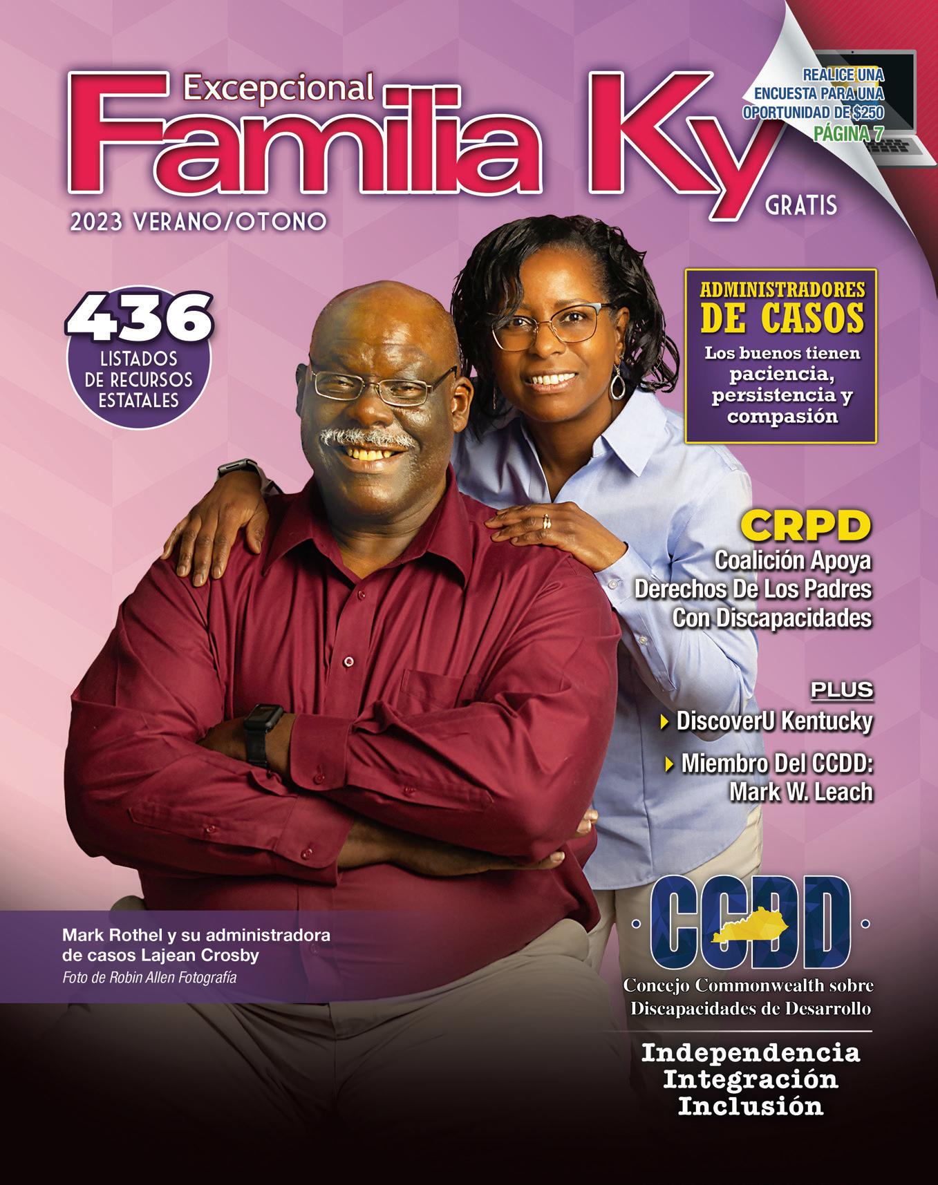 Independencia Integración Inclusión 2023 Invierno/Primavera 13 ¿Qué hace a un buen administrador de casos? Paciencia, persistencia y compasión 14 Perfil de miembro de CCDD La pasión alimenta la defensa de Mark W. Leach 4 Carta del CCDD David Allgood en conectándonos con legisladores 10 CRPD Apoya el derecho de los padres Protegiendo a las personas con discapacidad 16 Directorio de recursos de la A a la Z La lista estatal proporciona información crucial 12 DiscoverU Kentucky Uniendo el comunidad de discapacitados Artículos de Fondo 2023 “Excepcional Familia KY” es publicado por Commonwealth Council on Developmental Disabilities 1024 Capital Center Dr., Frankfort, Kentucky 40601 (502) 564-7841 • www.CCDD.KY.gov Editor.....................................John Lynch Artista Grafico........................Nick Farr (859) 494-1140 / johnplynch1950@gmail.com La defensa funciona En la portada: Mark Rothel del Concejo CCDD con su administrador de casos Lajean Crosby de New Vista en Lexington. Los dos han trabajado juntos durante seis años. (Foto de Robin Allen Fotografía.) ¿Necesita Más Copias? Para obtener copias gratuitas, llame al (859) 223-1765 o mande un correo electrónico a john@lexingtonfamily.com ¿Hablas Espanol? Para la versión en español, visite, www.lexingtonfamily.com 2 www.lexingtonfamily.com