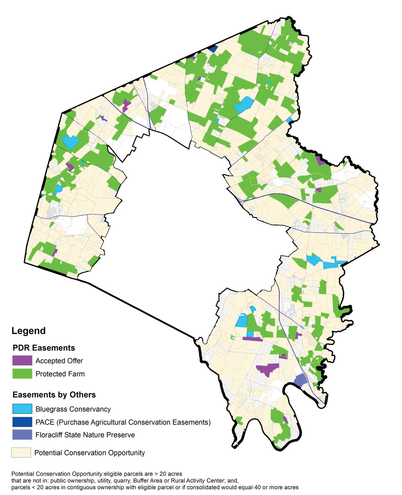 In 1999, the first Rural Service Area Land Management Plan was adopted as an element of the 1996 Comprehensive Plan. The groundbreaking document was the first extensive effort dedicated to the planning and management of land uses in the Rural Service Area. The 1999 Plan presented the case for the preservation of our rural land and suggested the implementation of an extensive land capability analysis. The Plan also recommended minimum lot sizes, establishment of rural land use categories, utilization of greenways and Focus Areas for recreation, preservation of rural settlements and scenic roads, infill and redevelopment, considerations for potential adjustments to the Urban Service Boundary, buffering of the urban edge, and the creation of a Purchase of Development Rights Program. Implementation would include changes to Lexington-Fayette County’s Zoning Ordinance and land use maps and the development of further studies, plans and programs.