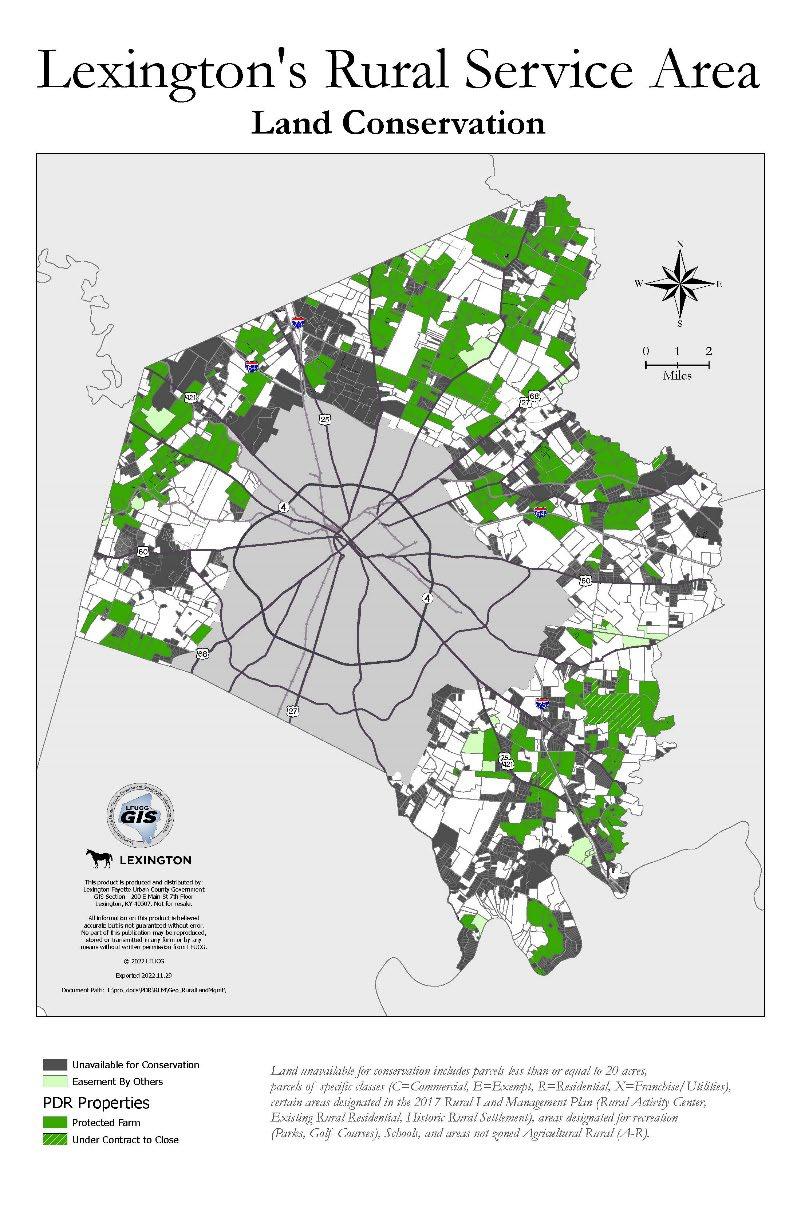 Q w Q I I I I I I ! ! I I ! ! I t I t This product is produced and distributed by: Lexington Fayette Urban County Government GIS Section 200 E Main St 7th Floor Lexington, KY 40507. Not for resale. All information on this product is believed accurate but is not guaranteed without error. No part of this publication may be reproduced, stored or transmitted in any form or by any means without written permission from LFUCG. © 2022 LFUCG Exported 2022.11.29 Document Path: T:\pro_docs\PDR\RLM\Geo_RuralLandMgmt\ ® 0 2 1 Miles Unavailable for Conservation Easement By Others PDR Properties Protected Farm Under Contract to Close