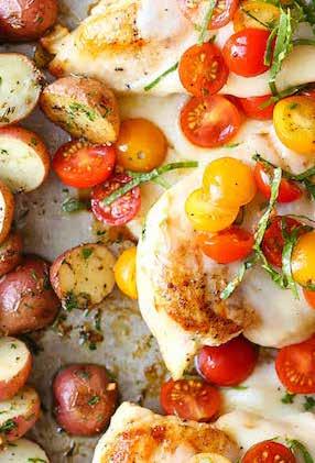 Preheat the oven to 400°F. To make the bruschetta, combine all ingredients in a medium bowl; season with salt and pepper, to taste, and set aside. Season chicken with salt and pepper, to taste. Place chicken and potatoes on a prepared baking sheet in a single layer. Add olive oil, garlic, thyme, oregano, basil, and Parmesan; season with salt and pepper, to taste. Gently toss to combine. Bake until the chicken is cooked through and the potatoes are golden brown and crisp, about 20-25 minutes. Top the chicken with mozzarella during the last 10 minutes of cooking time. Serve immediately, topped with bruschetta. n