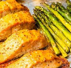 Preheat the oven to 400°F. Combine and stir the two mustards and honey, and set aside. Place the potatoes and asparagus on a prepared sheet pan and pour the olive oil over top, toss to coat, and season with salt and pepper. Add the salmon filets to the sheet pan and spoon the honey mustard glaze on top to coat and bake for 12 minutes. Remove the pan, flip the potatoes and asparagus, and return to the oven for 8-10 minutes until the potatoes are cooked through and the salmon is done to your liking.