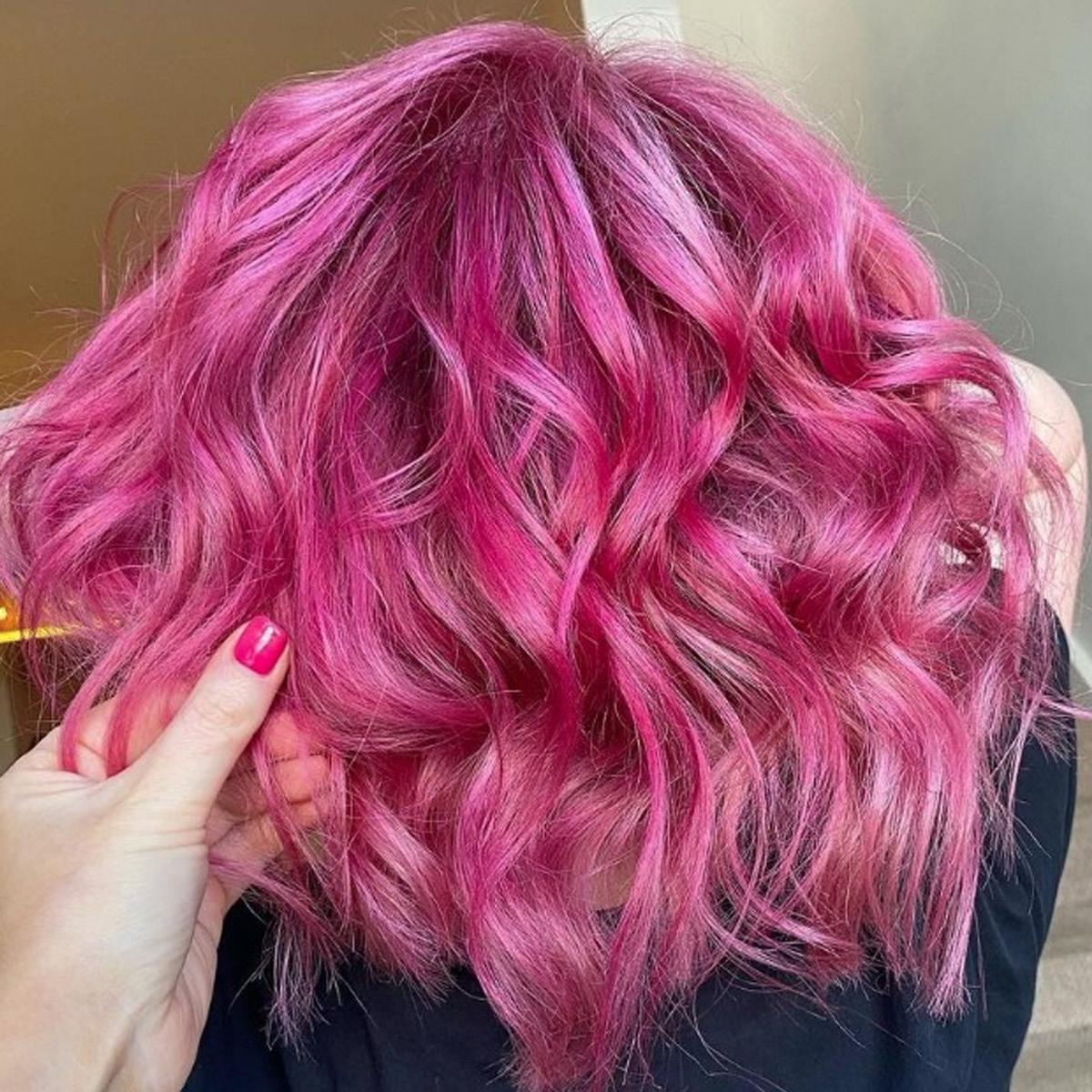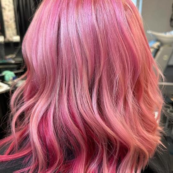 Blonda 7 + 3% (10vol) LH Developer + blended with .526 Rouge Magenta + 1.5% (5vol) Jewlz Developer