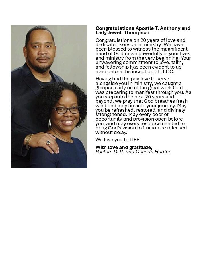 In 2003, following divine instruction, Pastor Thompson relocated to Harford County, MD In 2006, he founded Love Fellowship Christian Center, a church of “Kingdom Builders” dedicated to love, discipleship, and community transformation. Under his leadership, LFCC has grown spiritually and numerically, birthing impactful ministries and leaders