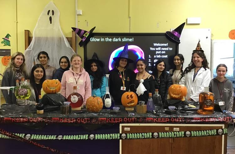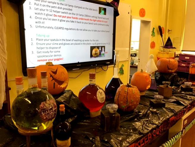 Our first session of the term ‘Spooky Science’ was a chance for 30 Year 7’s to make glow in the dark slime in our J4 chemistry lab, which had been decked out for the occasion with hauntingly fun decorations, overflowing dishes of bubbling slime, vats of witches brew and chemistry themed carved pumpkins! Our brilliant Year 12 helpers were on hand to make sure the Year 7’s got the slime recipe just right! We ended the session with a demonstration of foaming pumpkins, which illustrated the exothermic decomposition of hydrogen peroxide into oxygen gas and water.