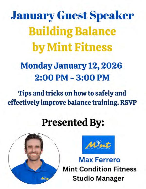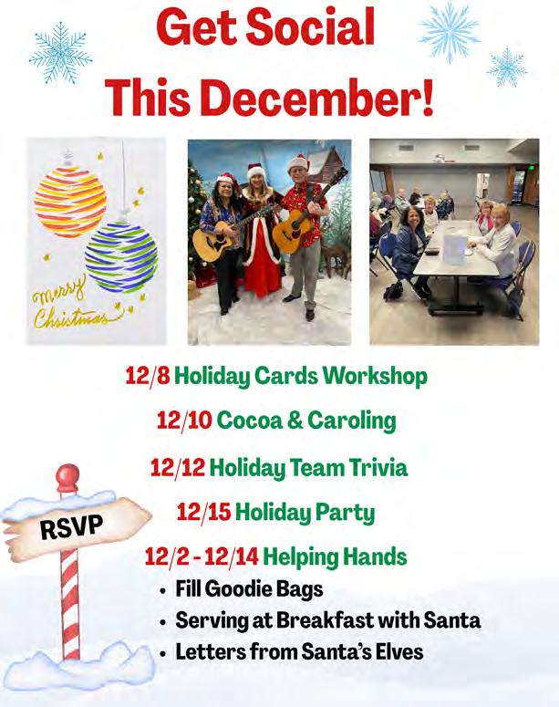 We look forward to continued merriment in December. There are a lot of fun ways to get social and try something new this month. There will be FREE yoga on Wednesdays with Angela. FREE Chair Zumba will continue Mondays and FREE Sit and Be Fit with Angela on Fridays. Get crafty with clothespin snowflakes and crafting handmade holiday cards. Don’t miss Coco and Caroling with live music by Wednesdays Art and Music Appreciation instructor Ed and member Claudette. Join the Holiday edition of Team Trivia. Check out the calendar for Helping Hands, we are looking for volunteers to help prep supplies for a youth event, serving breakfast at family holiday events, and a very special task of becoming an elf and responding to letters from Santa! On Monday, December 15th we will host our Holiday Social across the street at the Youth Recreation Center. Dress in your favorite Christmas sweater or red and green and join us for music, a train display from Golden State Trains, Christmas card photo opportunities, clay gift tag making, refreshments, fun and games! A few reminders, our offices will be closed starting on December 22nd and re-opening on January 5th. Be sure to renew your membership before January for a discount! Thank you to over 200 of you who have already chosen to renew and be 2026 members!
