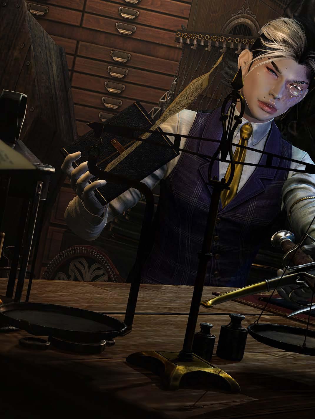 ON KAI (at right): HAIR MODULUS SHELBY HAT & HAIR + OUTFIT [CONTRAPTION] WEBB’S WAISTCOAT