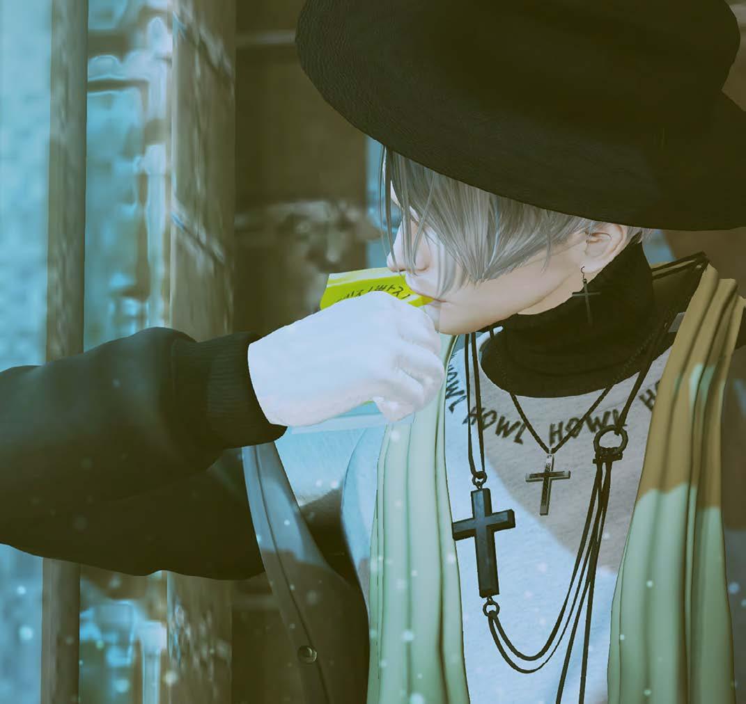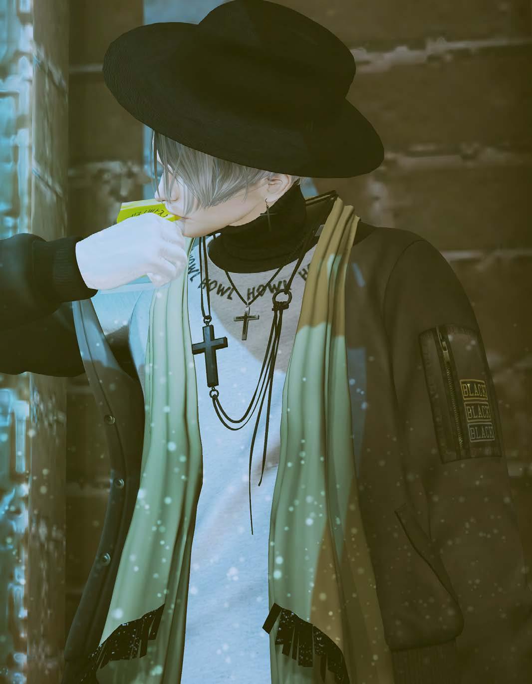 HAT RABU. LEATHER FEDORA + HAIR TRAM G0106 + TOP [DEADWOOL ERNST SWEATER DANDY ADD-ON TURTLENECK + HOWL CHEN BOMBERS JACKET + ACCESSORIES PUNCH CROSS EARRING + GABRIEL CROSS CATENA NECKLACE + ETHAM METAL CROSS #1 (long) + NOCHE BUCK LEATHER GLOVES + SEY VH STOLE
