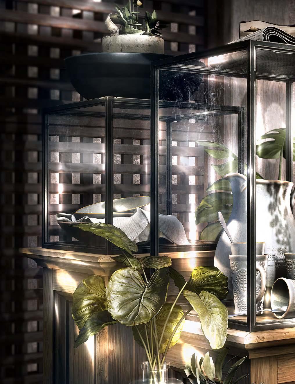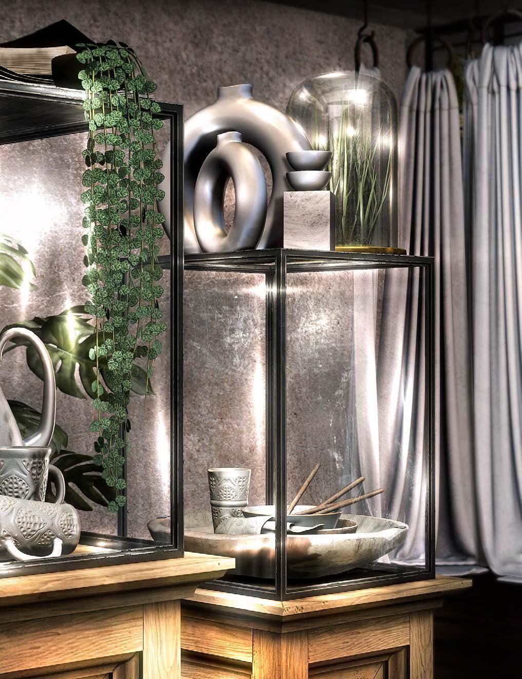 GOLDFRAB GRASS AND GLASS DECOR + FANCY DECOR THULDEN BOWL + APPLE FALL GALLERY PODIUM SHOWCASES + WEST VILLAGE LILY LEAVES SPRAY (left, foreground) + KAZZA BYTHESEAPOT PLANTPOT + LUCIE ET LUCIAN WILAR VILLA BUNGALOW (used throughout, custom order only)