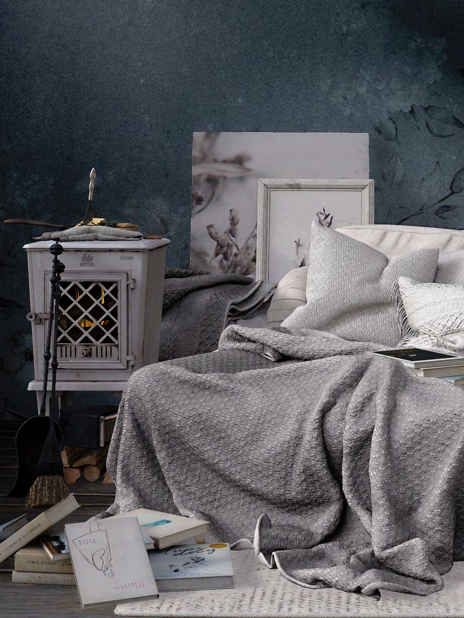 AVANI ALIX COLLECTION BOOKS IN GRASSCLOTH SLIPCASE + BLACK NEST PAETA BIRD + FANCY DECOR CATALAN DAYBED + WYATT LAMP (on shelf)