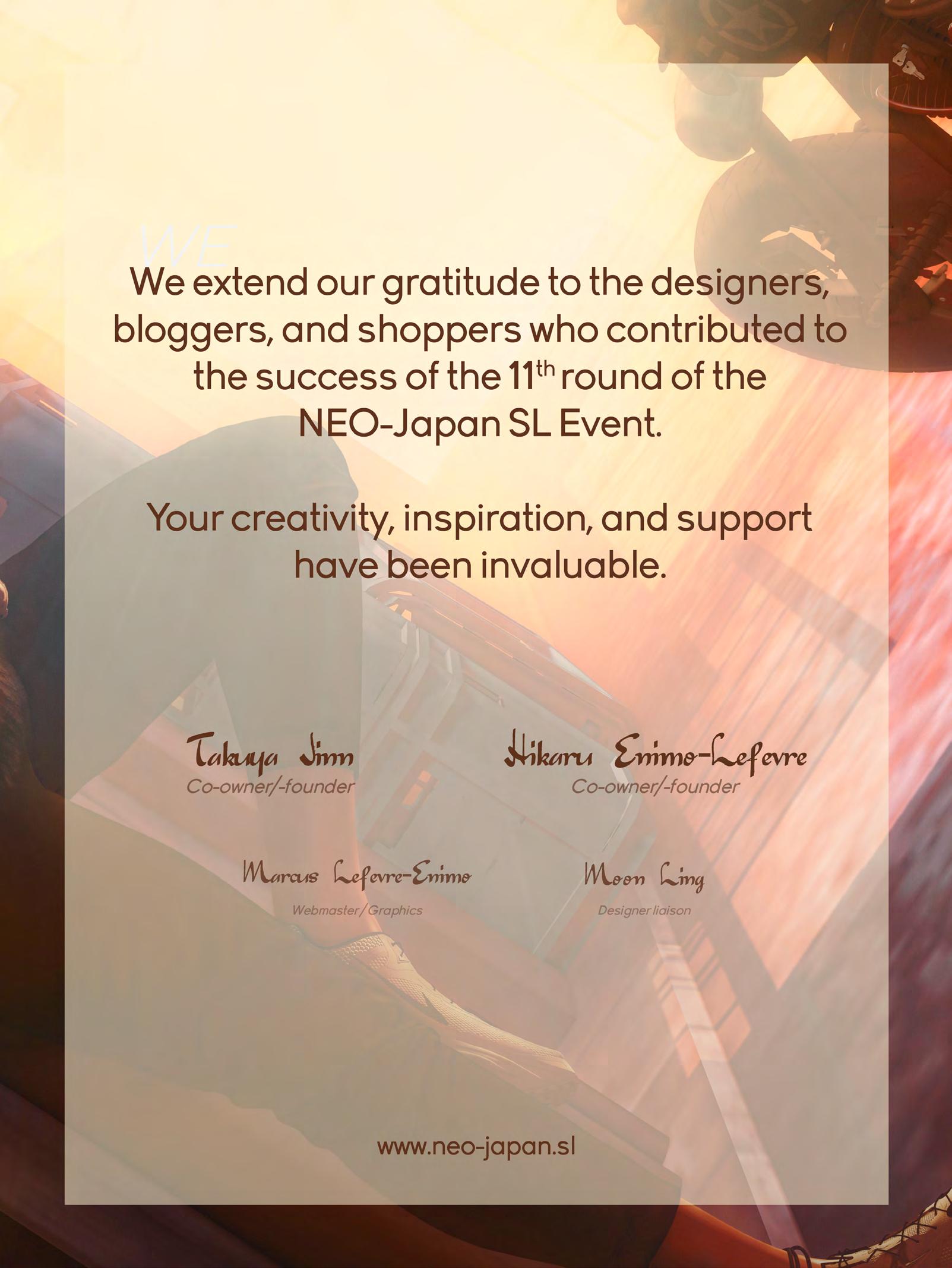I would like to thank all Designers, Photographers, Stylists and also my Staff for working hard within tight deadlines in order to present all the wonderful creations currently available in Second Life.