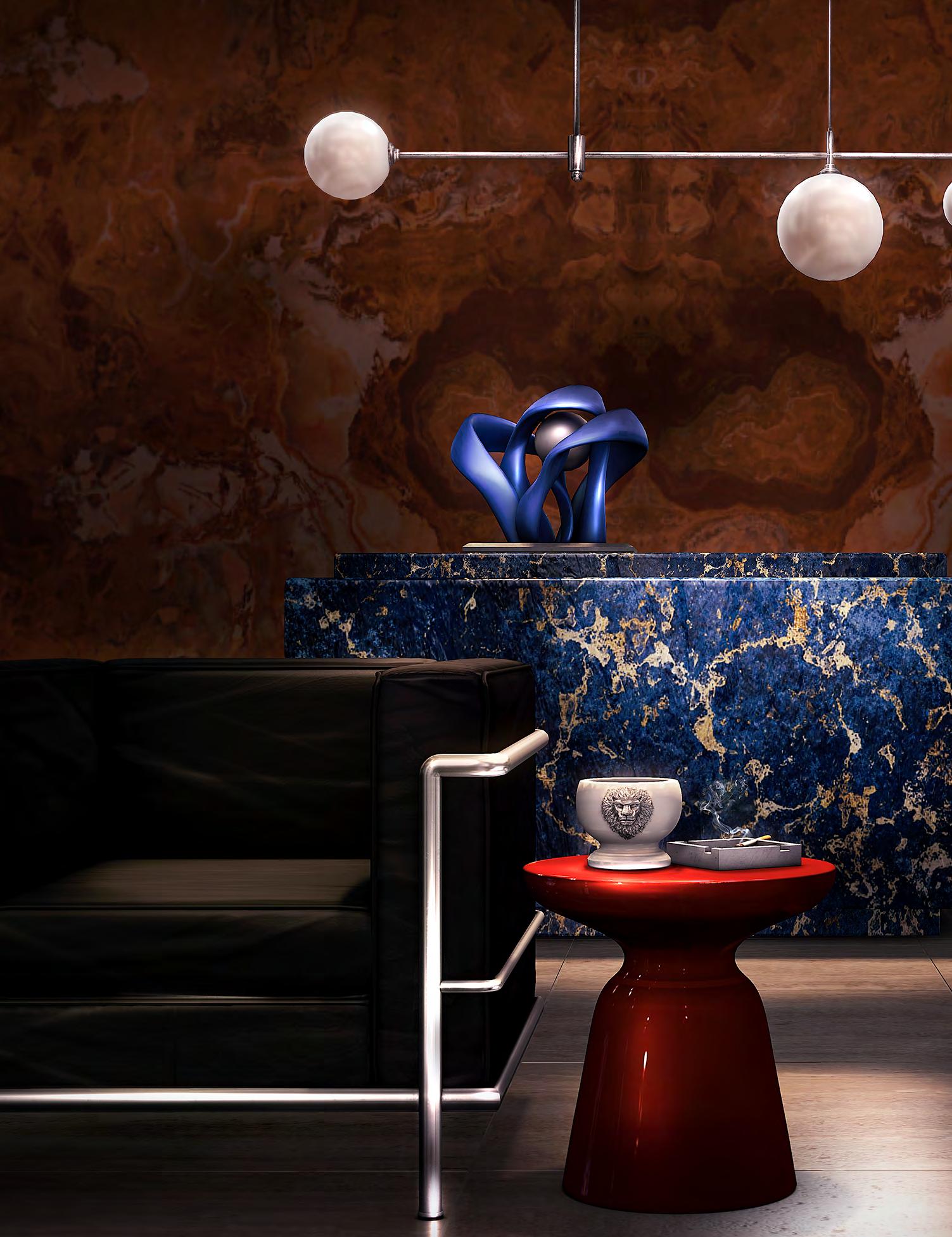 FANCY DECOR CLASSIC MODERN CHAIR + DAVIDSON ASHTRAY + THORTON CHANDELIER (Silver) + DAHLIA X MADRAS HAILEY - LION SOUP BOWL – SILVER + THE VORDUN MUSEUM & GALLERY BLUE AND WHITE NO. 3 SCULPTURE + LOFT & ARIA MARTINI TABLE RED + LUCIE ET LUCIAN LUDWIG SKYBOX (custom-orders only) + *CONSOLE TABLE, DECORATOR’S OWN.