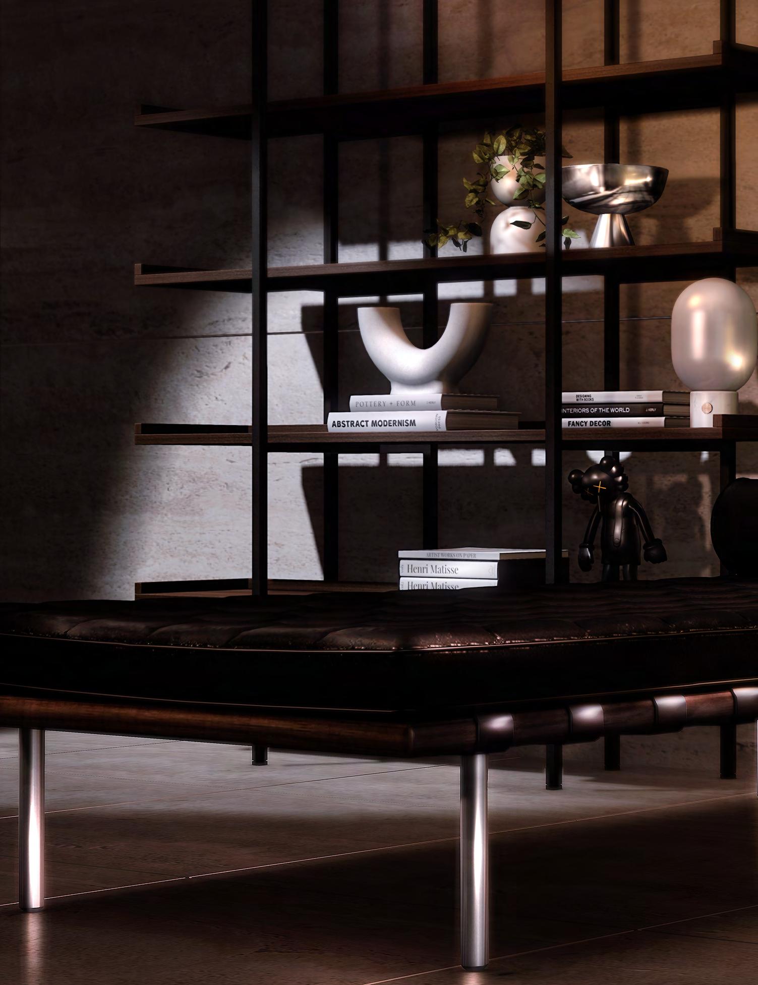 + KLEINE BOOKS + JENKINS BOOKS AND VASE & JENKINS BOWL + HAIKEI YOUR BLOOM/1 (sidetable) & YOUR BLOOM/6 (lamp – tinted for this photo) + SERENE/3 (left, plant on shelf) + MOOD BAD DAY (left, kaws figurine on shelf) + LUCIE ET LUCIAN LUDWIG SKYBOX (CUSTOM-ORDERS ONLY)