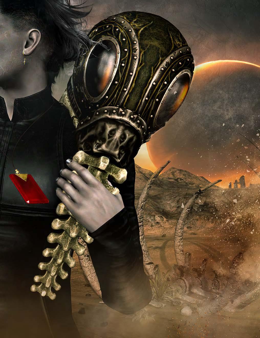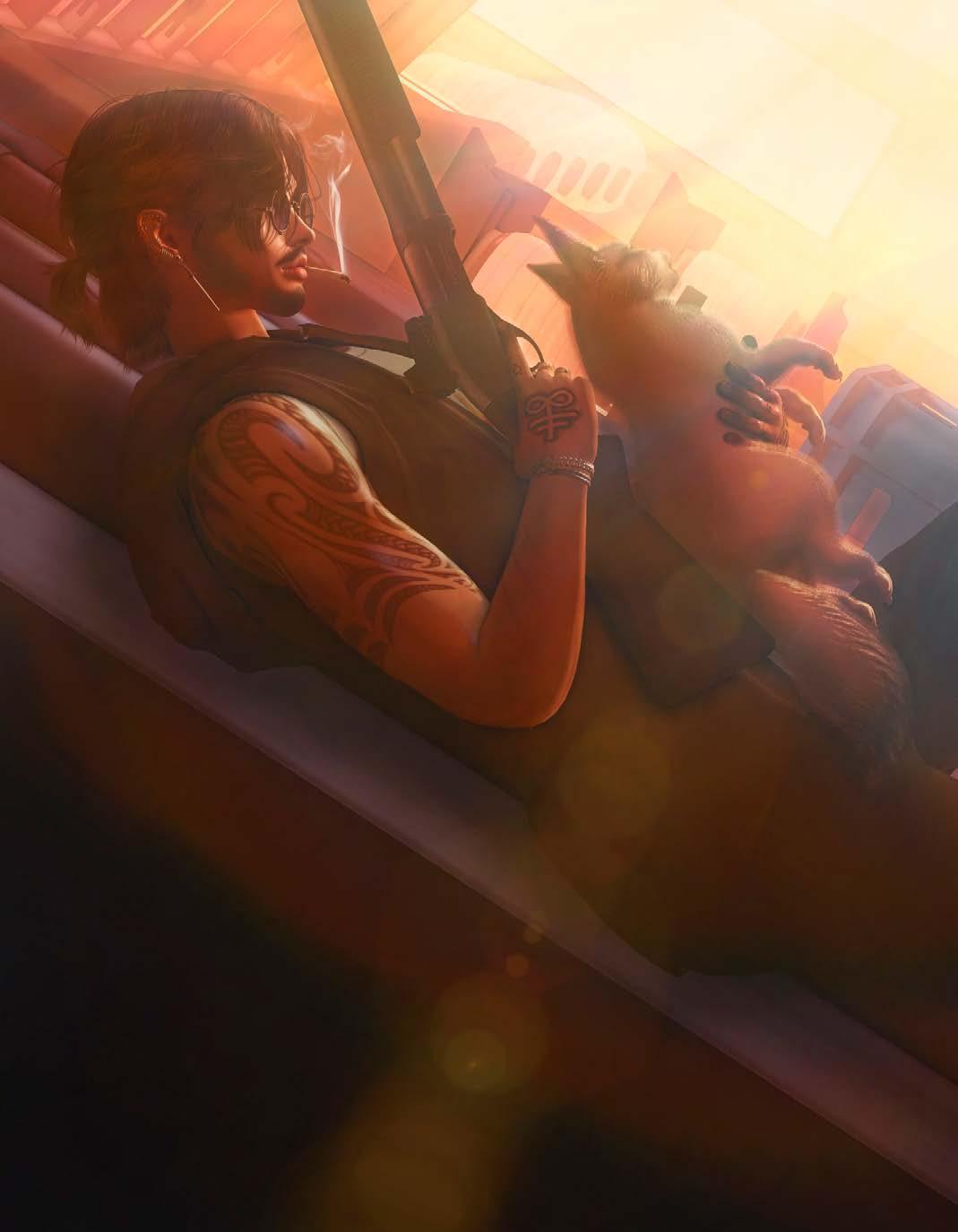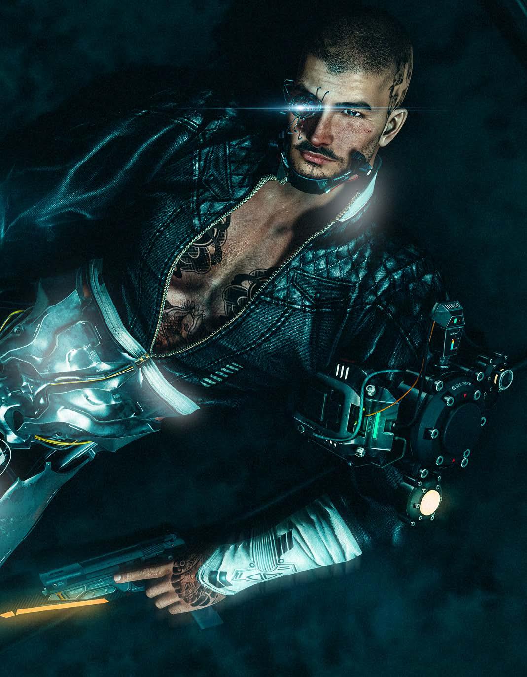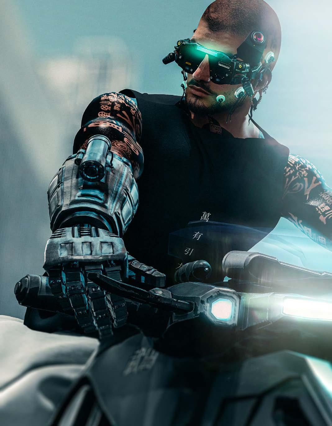 TOP [DOPE+MERCY] GRAVITATION T-SHIRT + TATTOO CORAZON KIMI + ARM [THE FORGE] SURGE CANNON + ACCESSORIES SOLE SCO KIT EMITTER AND VISOR + ECLIPSE ART STUDIO OKAMI EARRING SWALLOW GAUGED S + VEHICLE [THE FORGE] TAKEDA CYBER BIKE