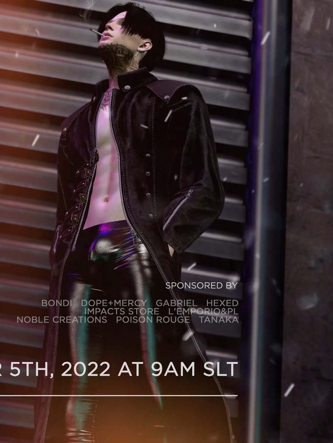 ON OUR COVER is Tanaka Cloud, designer-owner of Tanaka, and co-founder of Tokyo Zero Event. A few years ago, Tanaka burst into the Second Life creators arena with his army of a close-knit team, and almost instantly established his self-named brand. To date, Tanaka Store has a huge collection of clothing and accessories for men, designed with his bold forward vision of Japanese pop culture. We appreciate your contribution to Men’s Fashion and wish you continued successful branding and business execution.