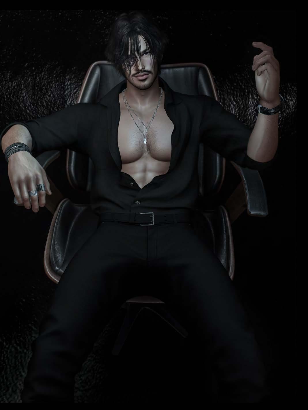 HAIR DURA-U117-FA + HEAD LELUTKA EVOX EON + FACIAL HAIR VOLKSTONE EVAN + SKIN CLEF DE PEAU.JOEY TAN [VELOUR] + VELOUR “EROS” BODY SKIN (tan) V2 + CLEF DE PEAU.BODY HAIR BLACK + TOP ELIYA.K–ADAM FRONT OPEN SHIRT + PANTS KAI. QYOP + ACCESSORIES RICHB. LUPE NECKLACE + BADWOLF STEN BRACELET + KUNST MEN’S RINGS COLLECTION II + DEADWOOL NUVOLARI CHRONOGRAPH BLACK DIAL + DECOR: KUNST BENNET CHAIR