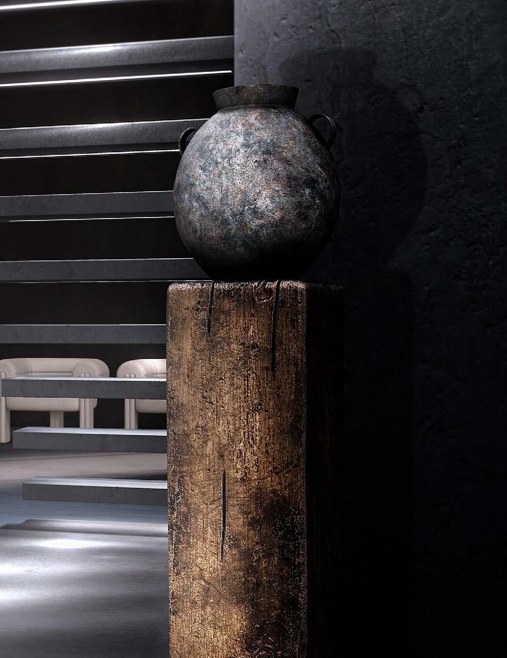 AVANI DATO COLLECTION RECLAIMED BEAM PEDESTAL WITH VESSEL + FANCY DECOR