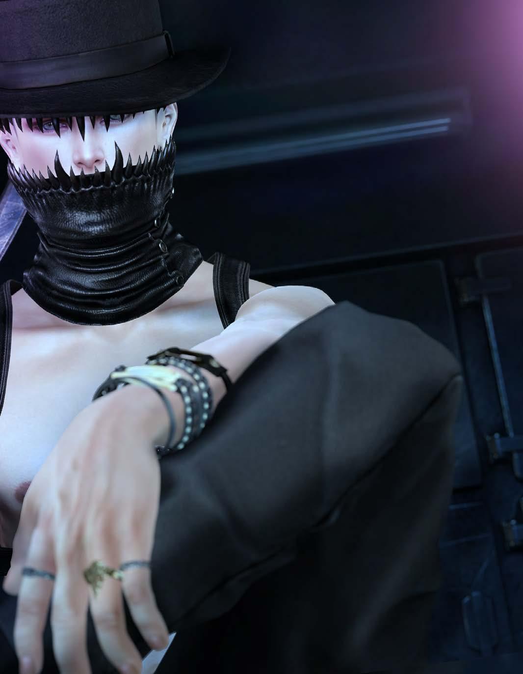 HAT [CONTRAPTION] HIGHWAYMAN’S SHADOW SET + HARNESS & BLADE [CX] VARGR + PANTS GABRIEL TIGHT HAREM PANTS + ACCESSORIES MINIMAL AURKA BRACELET BLACK + LEGION BRACELET + NICO BRACELET [LIGNITE] + [CONTRAPTION] DESIDERATUS RING SET