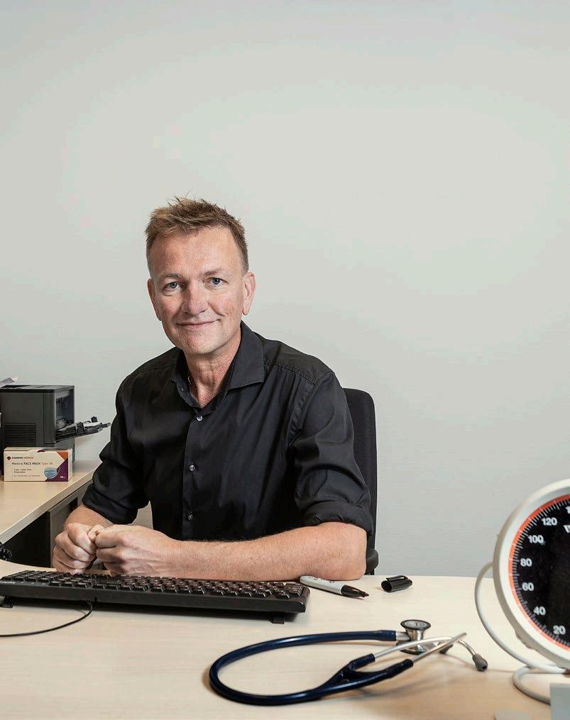 huisvesting; de praktijk die Sporrel in 2018 overnam was een praktijk aan huis waarin hij nog vier jaar heeft gewerkt. ‘De nieuwbouwplan nen waren er toen al. Dat hielp zeker mee bij mijn besluit tot overname.’ Samen met fysiotherapeuten en apotheker werkten de drie praktijk houders het plan voor het gezond heidscentrum uit. ‘We hebben vanaf 2018 lange tijd iedere vrijdagmiddag bij elkaar gezeten. Het hielp dat ik zeven jaar als waarnemend huisarts had gewerkt en daardoor allerlei praktijken van binnen had gezien. Een daarvan had een mooie vide, dat idee hebben we overgenomen. Vanaf de vide heb je zicht op de bibliotheek van het mfc.’