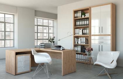 Scrivania Solution. Di colore bianco Artik e rovere Canadian, con cassettiera a 3 cassetti.