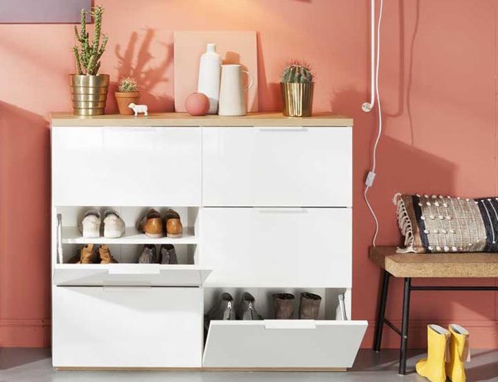 Scarpiera Mundi a 6 ribalte. Di colore bianco laccato e rovere. 120x35x103h cm. BS3491K64904