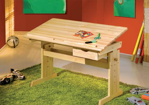 I n vero pino massello naturale, trattato con vernici ecologiche. Con cassetto e piano inclinabile. 108x55 cm; altezza regolabile. 30600020