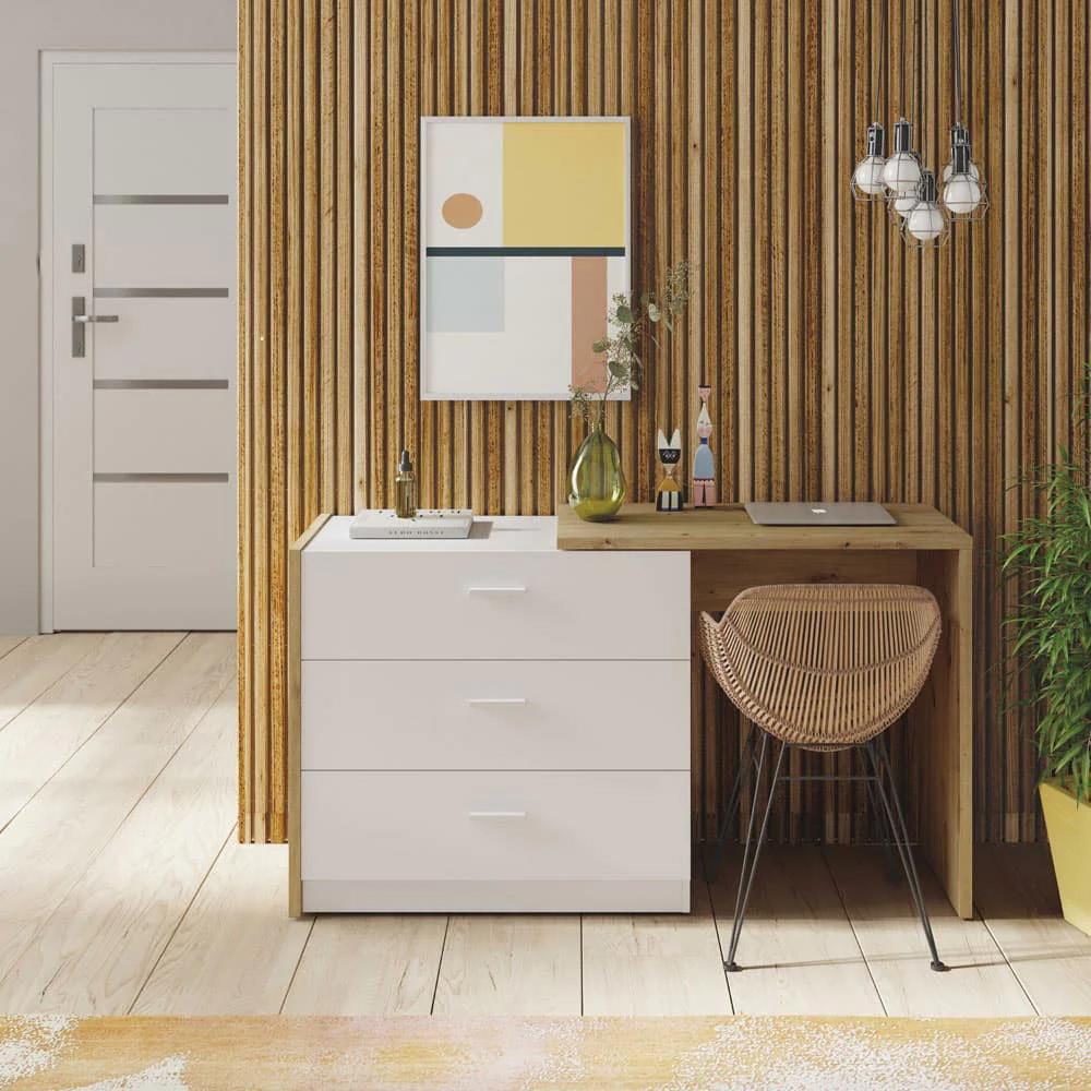 Cassettiera con scrivania estensibile. Con 3 cassetti. Di colore rovere Nodi e bianco Artik. Mobile chiuso: 81x40x75h cm. Mobile aperto: 130x40x75h cm. 017849W