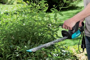 Tagliasiepi Gardena EasyCut elettrico 450/25. Con impugnatura regolabile, testa angolata e archetto di protezione per piante; diametro di taglio 250 mm. HL987020