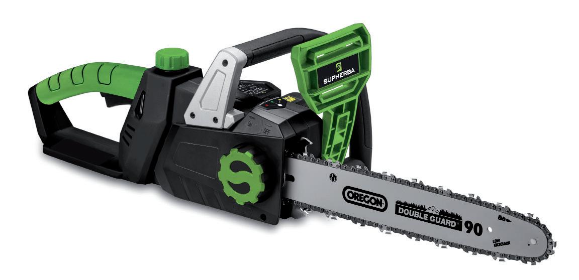 Serbatoio dell’olio 150 ml. Sistema a doppia batteria, montaggio e tensione della catena senza utensili, barra “OREGON” con stella e catena a basse vibrazioni. Freno meccanico antirimbalzo, lubrificazione automatica della catena, avviamento delicato, spia di sovraccarico. Impugnatura morbida con “Soft Grip”.