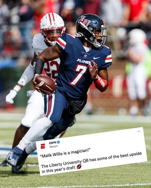 of his stellar play on the field and outstanding character off the gridiron, Liberty’s Malik Willis was named the 2021 Bobby Bowden Trophy winner. The Bobby Bowden Trophy recognizes the college football playoff player who epitomizes a student-athlete of faith. The award winner must conduct himself as an exemplary model in the classroom, on the field, on campus, and in the community.