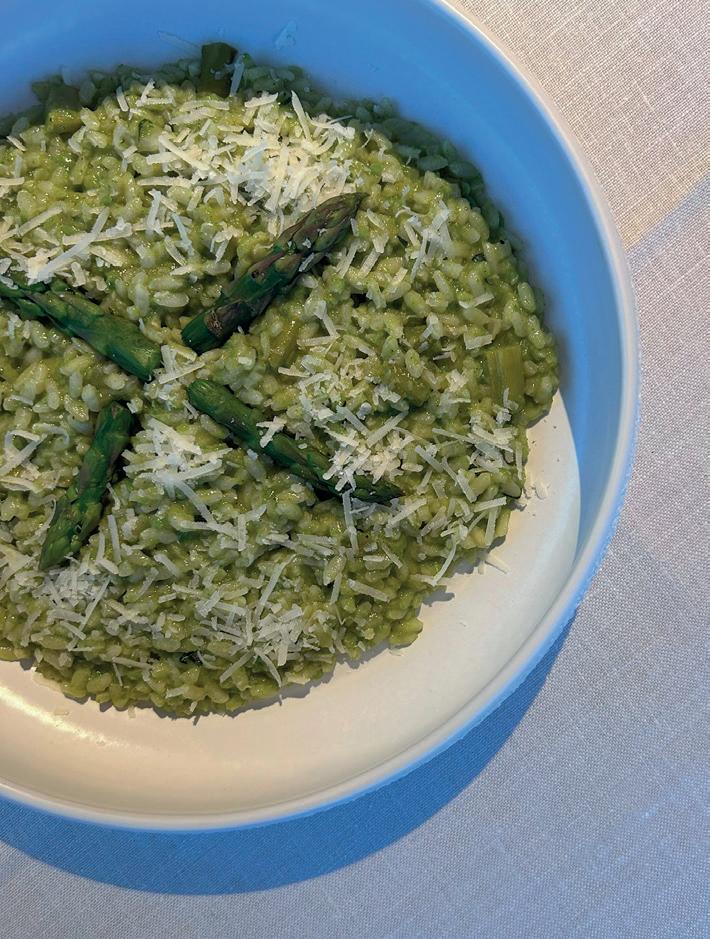 Verhit olie en 1 el boter in een ruime pan. Fruit sjalotten glazig, voeg asperges en dragon toe. Roer de rijst erdoor tot alle korrels bedekt zijn.