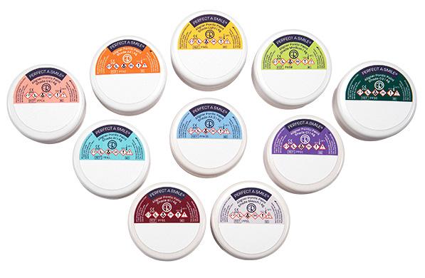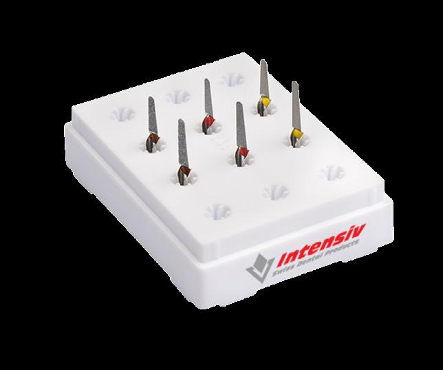 Set containing eight grinding instruments for cutting, trimming and finishing of soft-elastic and hard-elastic material. With color coding for easy identification.