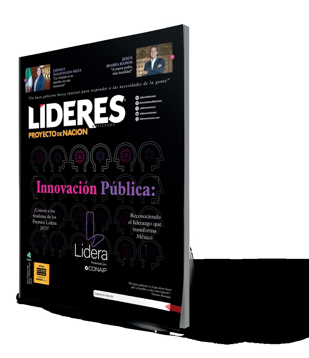 Líderes Mexicanos es publicada once veces al año por FERRÁEZ COMUNICACIÓN, S.A. de C.V., Avenida Revolución 1267, piso 19 Int. 1976, Los Alpes, Álvaro Obregón 01010, México, D.F.; teléfono 91365100. Miembro activo de la Cámara Nacional de la Industria Editorial Mexicana No. 1864. El título de la presente publicación, así como el contenido, se encuentran debidamente autorizados y protegidos por la Comisión Calificadora de Publicaciones y Revistas Ilustradas, Secretaría de Gobernación, como consta en los Certificados de Licitud de Título No. 6375 y de Licitud de Contenido No. 5056 expedidos ambos con fecha 12 de agosto de 1992. Asimismo, esta publicación se encuentra protegida y registrada ante la Dirección General de Derechos de Autor, Secretaría de Educación Pública, según consta en la Reserva de Derechos No. 04-2014-090513591700-102. Derechos Reservados “D.R.”, “C”. Presidente Editorial y Editor Responsable Raul H. Ferraez Perez Pascal. Porte pagado y autorizado por SEPOMEX número PP09-0203; Publicada mensualmente por Ferráez Comunicación S.A. de C.V. edición CDLXXXIV Noviembre 2025 Las opiniones vertidas en este número no son necesariamente las del editor. Se encuentra totalmente prohibida la reproducción parcial o total por cualquier método de esta publicación. De esta edición fueron impresos 43,000 ejemplares.