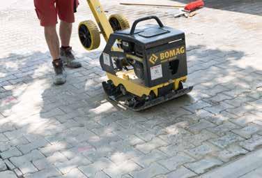 Pflasterfläche nach dem ersten Verfugungsvorgang unter ausreichender Wasserzugabe mit geeigneten Verdichtungsgeräten (Rüttelplatte, Rüttelwalze, Handstößel…) in Abhängigkeit von der eingebauten Steinart und -größe gleichmäßig bis zum Erreichen der Standfestigkeit in der Bettung verdichten. Fugen so oft auf volle Höhe füllen, einschlämmen und rütteln bis kein Nachsetzen der Fugenfüllung zu beobachten ist. Die gepflasterte Fläche ist nach dem Rütteln sofort benutz- und befahrbar.