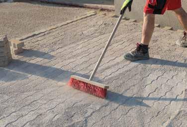 Zum Schutz der Materialoberfläche vor Kratzspuren und Kantenabplatzungen einen Rüttler mit Kunststoff- oder Gummigleitplatte verwenden. Nach dem Verfugen Fläche sauber abkehren und mit einer geeigneten Rüttelplatte unter ausreichender Wasserzugabe mehrmals längs- und quer abrütteln. Immer an der Außenseite der Fläche und am tiefsten Punkt beginnen. Nochmals mit Fugensand einkehren, einschlämmen und abkehren. Die Pflasterdecke ist nach dem Rütteln sofort benutz- und befahrbar.