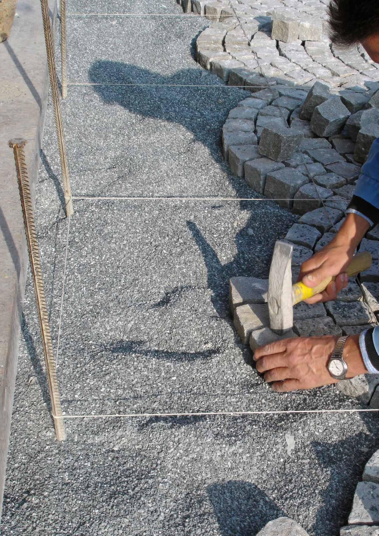 Die Steine sind im vorgegebenen Verband hammerfest zu pflastern. Unter hammerfest ist das gleichmäßige Hineintreiben des Steines in die Bettung zu verstehen. Durch das hammerfeste Hineintreiben des Steines soll die Bettung in den unteren Bereich der Fuge eindringen können und somit eine Verzahnung des Steines mit der Bettung erreicht werden.