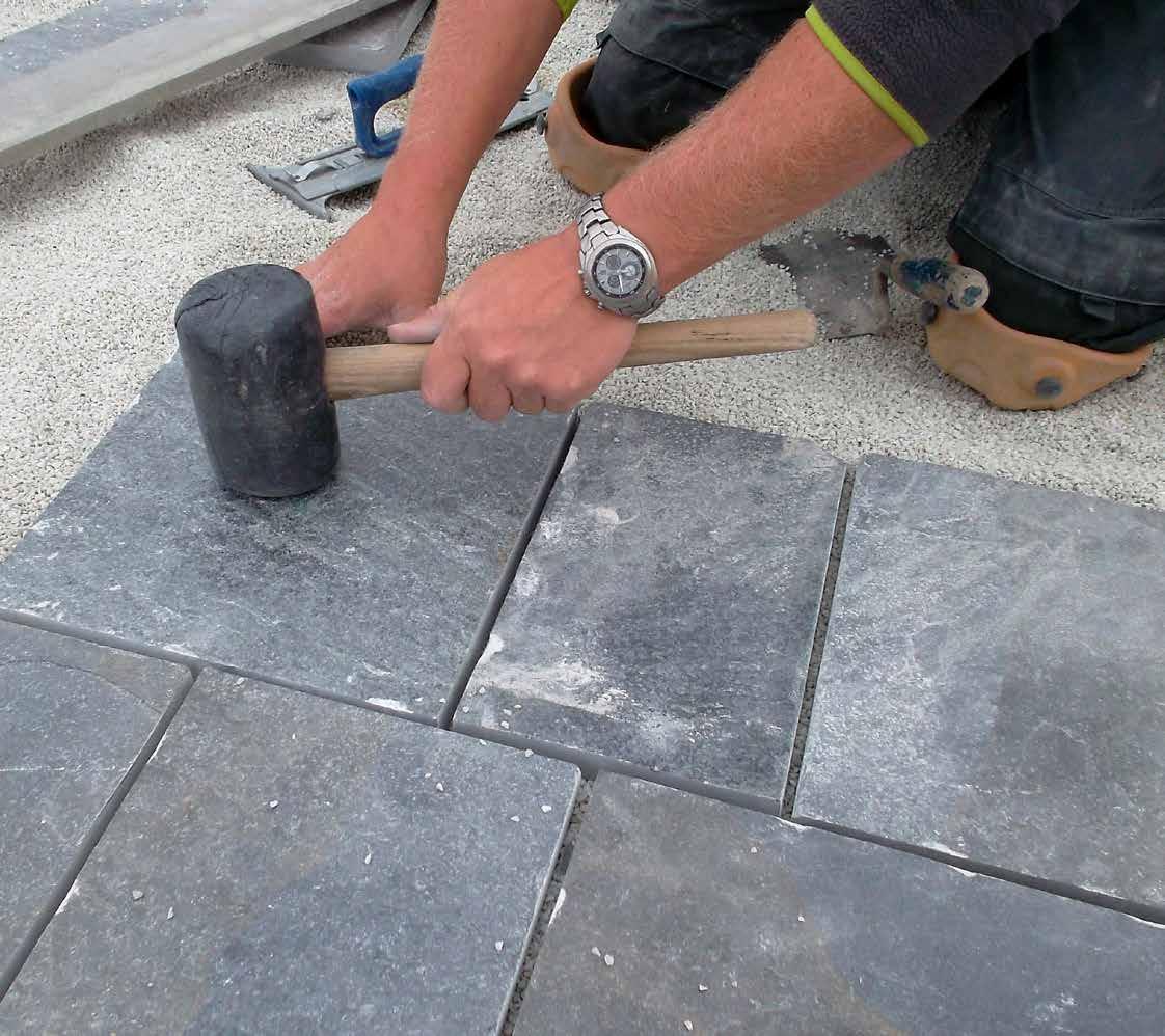 In der am tiefsten Punkt der Fläche gelegenen Ecke im rechten Winkel beginnen. Für die fluchtgerechte Verlegung eine Schnur spannen. Material von der bereits verlegten Fläche aus höhengerecht auf die Bettung verlegen. Platten von Hand oder mit Plattenheber verlegen und mit einem geeigneten Hammer einklopfen.
