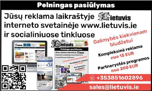 2 Nr. 10 (556) spalio 25 d., 2022 „Lietuvis“ E-mail: lietuvis.ie@gmail.com Redakcija nėra atsakinga už reklaminės medžiagos turinį. Disclaimer: The publisher cannot be responsible and liable for any contents of any advertising and other material contained herein whatsoever. Redakcijos nuomonė nebūtinai sutampa su autoriaus nuomone. Laikraščio platinimo klausimais kreipkitės telefonu: + 35385 1602896. For distribution queries call: + 35385 1602896. Reklamos klausimais kreipkitės telefonu: + 35385 1602896 sales@lietuvis.ie. For advertising call + 35385 1602896. Laikraščio tiražas – 1500 egzempliorių. ISSN 1649-5574 Lietuvos Respublikos ambasada Airijoje 47 Ailesbury Road, Ballsbridge, Dublin 4, IRELAND Tel.:+353 1 2035757, +353 1 2035737 Faksas: +353 1 2839354 El. paštas: amb.ie@urm.lt http://ie.mfa.lt Priėmimo laikas darbo dienomis: 10 - 13 val. Konsulinė informacija ir registracija darbo dienomis: 14 - 17 val. AMBASADA INFORMUOJA