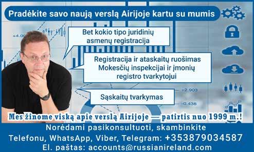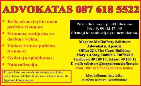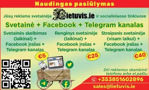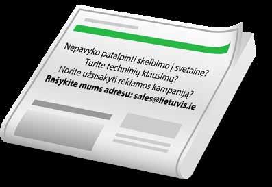 Redakcija nėra atsakinga už reklaminės medžiagos turinį. Disclaimer: The publisher cannot be responsible and liable for any contents of any advertising and other material contained herein whatsoever. Redakcijos nuomonė nebūtinai sutampa su autoriaus nuomone. Laikraščio platinimo klausimais kreipkitės telefonu: + 35385 1602896. For distribution queries call: + 35385 1602896. Reklamos klausimais kreipkitės telefonu: + 35385 1602896 sales@lietuvis.ie. For advertising call + 35385 1602896. Laikraščio tiražas – 1500 egzempliorių. ISSN 1649-5574