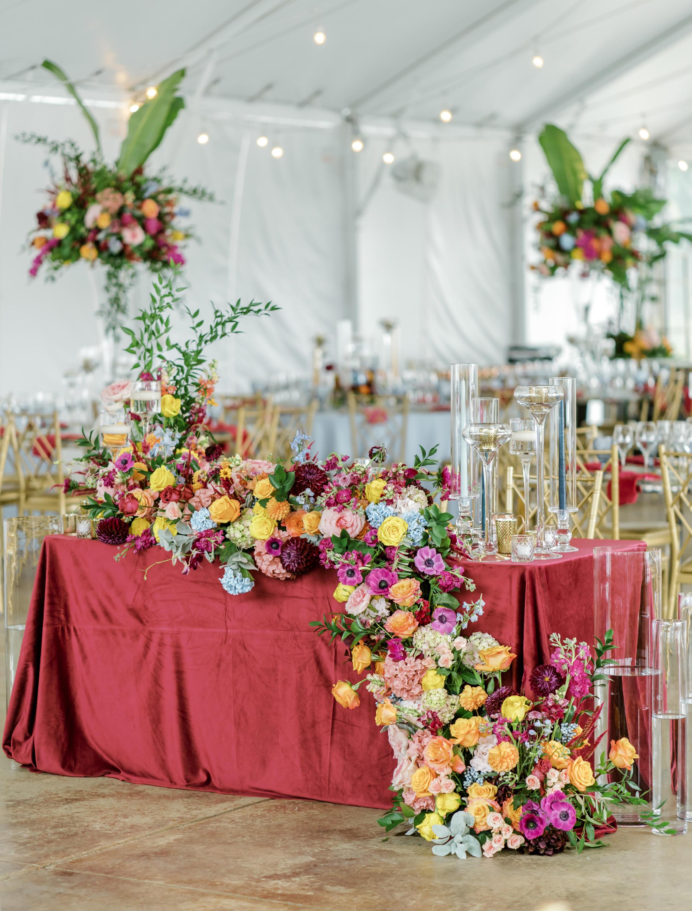 Since she had started dreaming of her wedding, Courtney, a professional event planner, always knew she wanted an outdoor tent wedding, but the color scheme and theme escaped her. Luckily, her incredible vendor team was able to help her curate the perfect design. Courtney’s favorite color is pink, so she knew she wanted her bridesmaids in that color. However, she didn’t want a ceremony overwhelmed with only pink. Her planner and florist helped her decide on incorporating green—which symbolized Josh’s love of the outdoors—and they ended up with a colorful pastel wedding! Since they had always envisioned getting married by the beach, the inclusion of banana leaves and vibrant colors were the perfect additions to bring in the tropical vibes. With Courtney's mom having passed away five years prior, they were also able to incorporate a few special touches to honor her. Their florist designed a beautiful floral piece for the chair she would have sat in and, as a nod to her mother's love for fireworks, their planner was able to organize a 15 minute show, despite town ordinances! We love how elegant but fun Courtney and Josh's special day turned out!