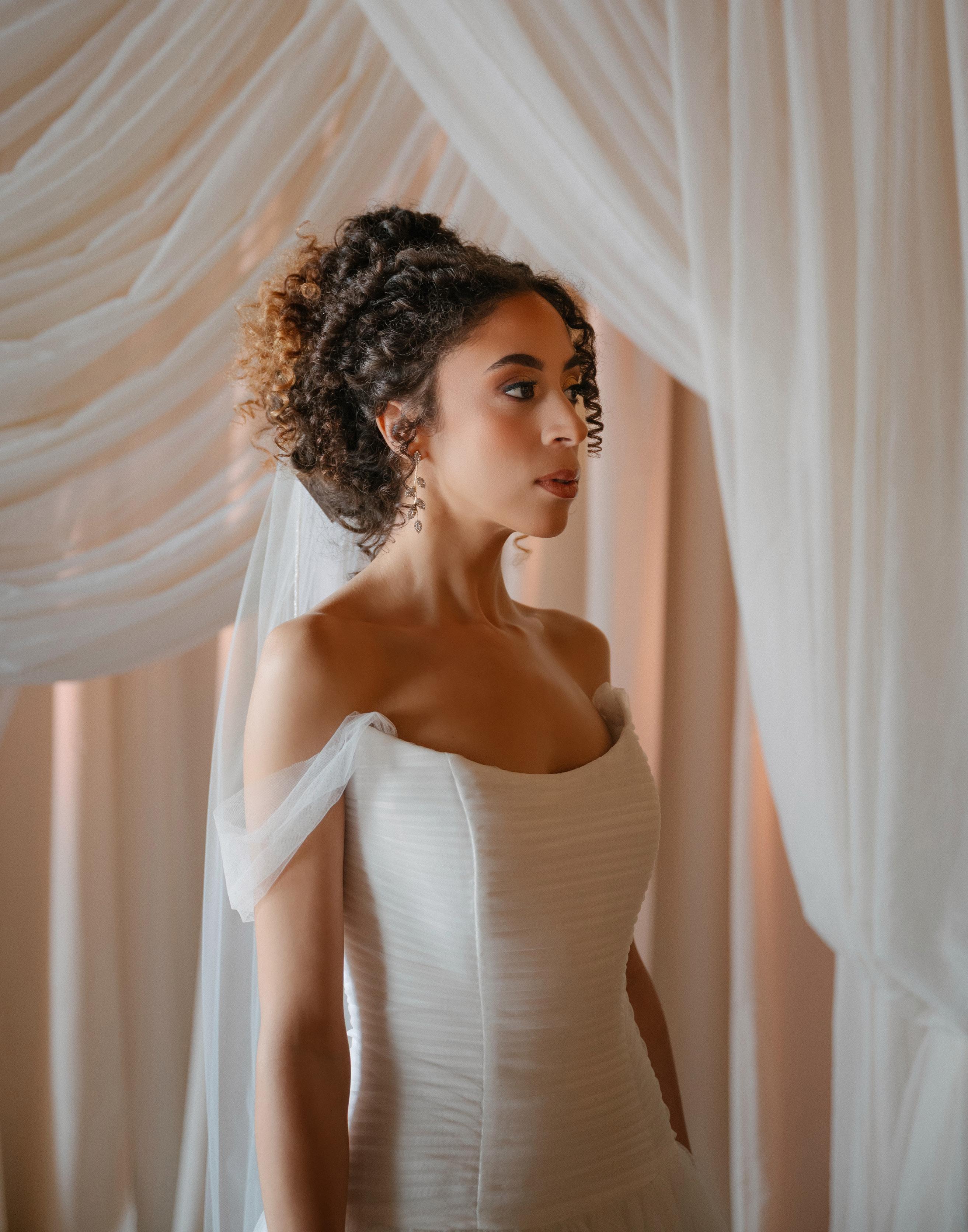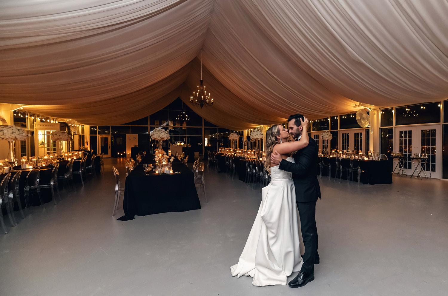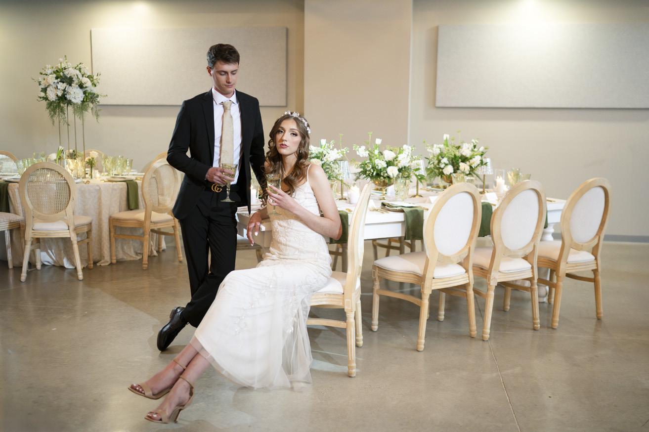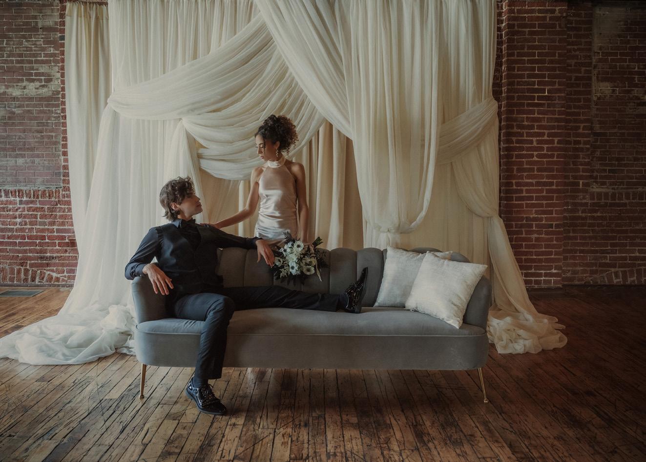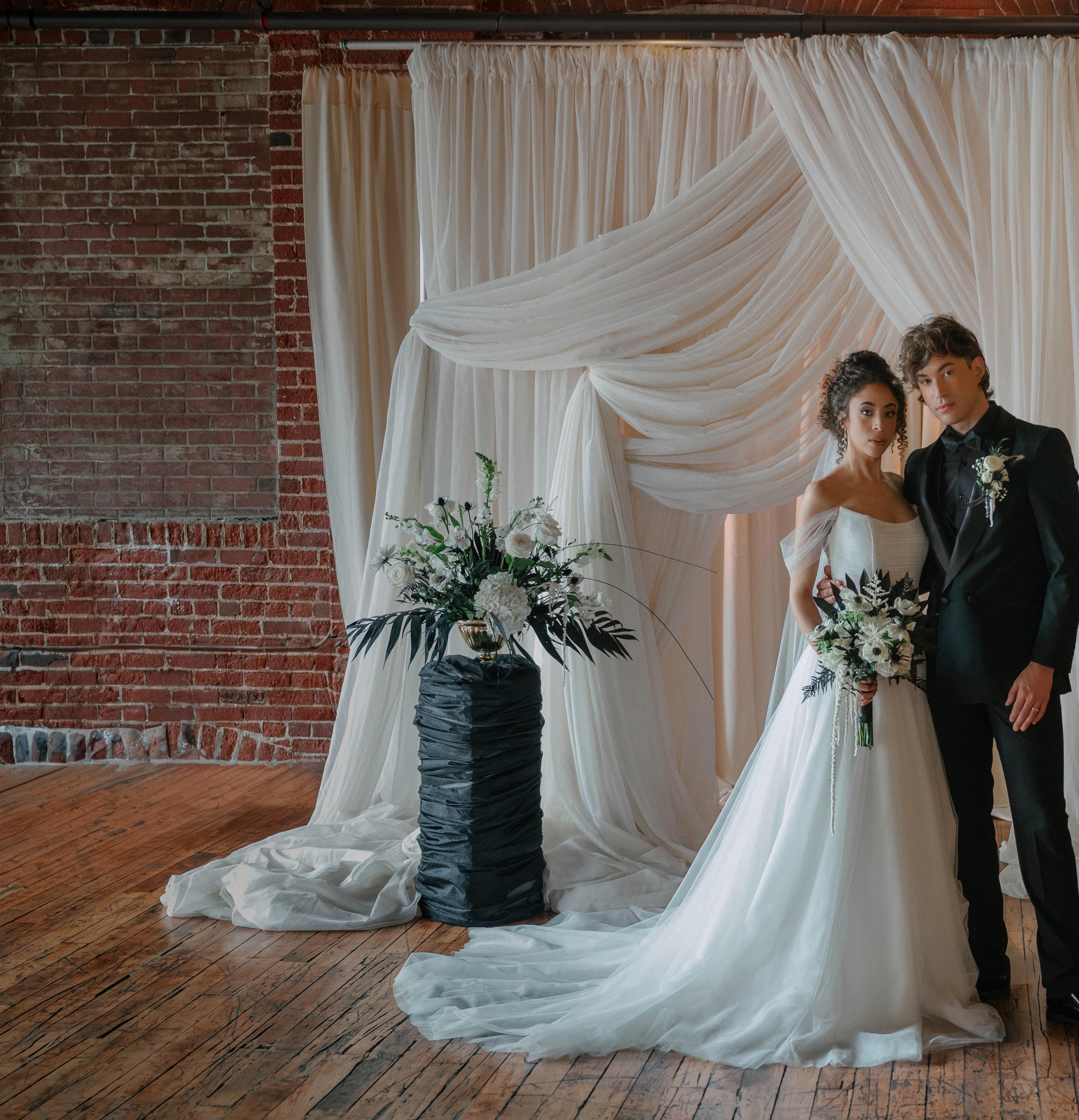This shoot proves that classic elegance can still feel fresh and bold with the right design details. The tablescape décor featured a timeless palette of neutral tones, elevated with striking pops of black for a sophisticated, modern edge. We especially love the modern table numbers and elevated glassware! One of our favorite design elements was the dramatic draping used in the ceremony area—a standout trend that added softness, movement and a sense of grandeur to the industrial space.
