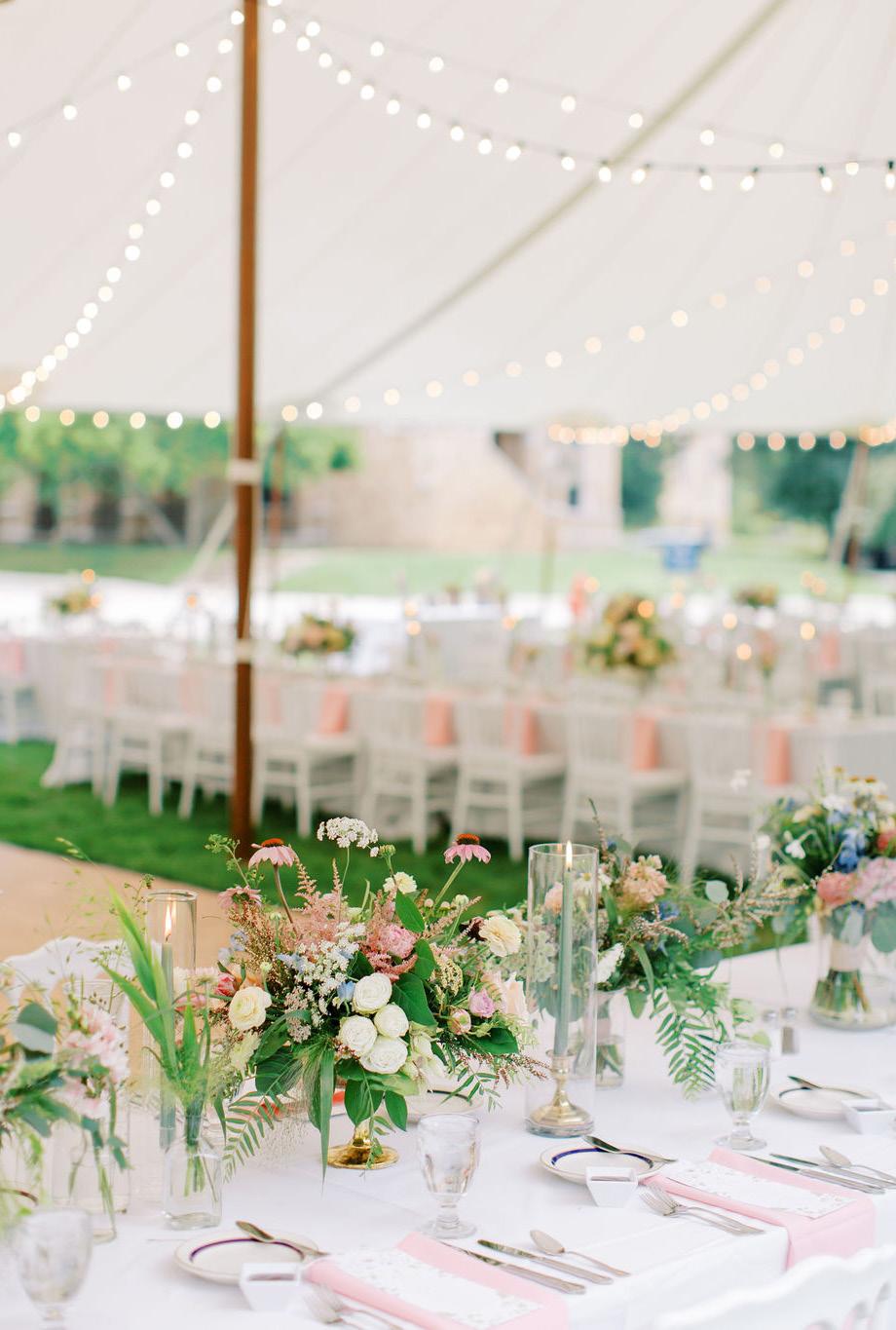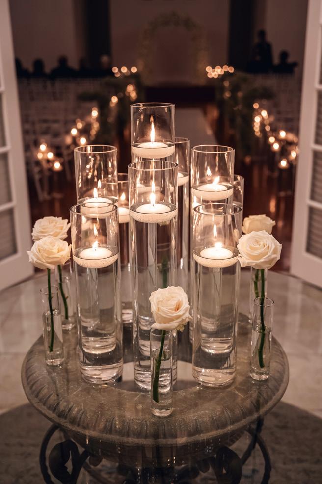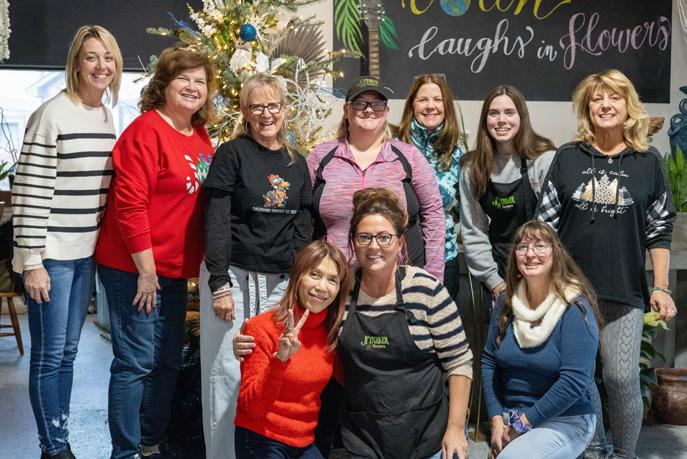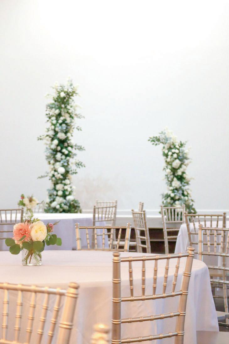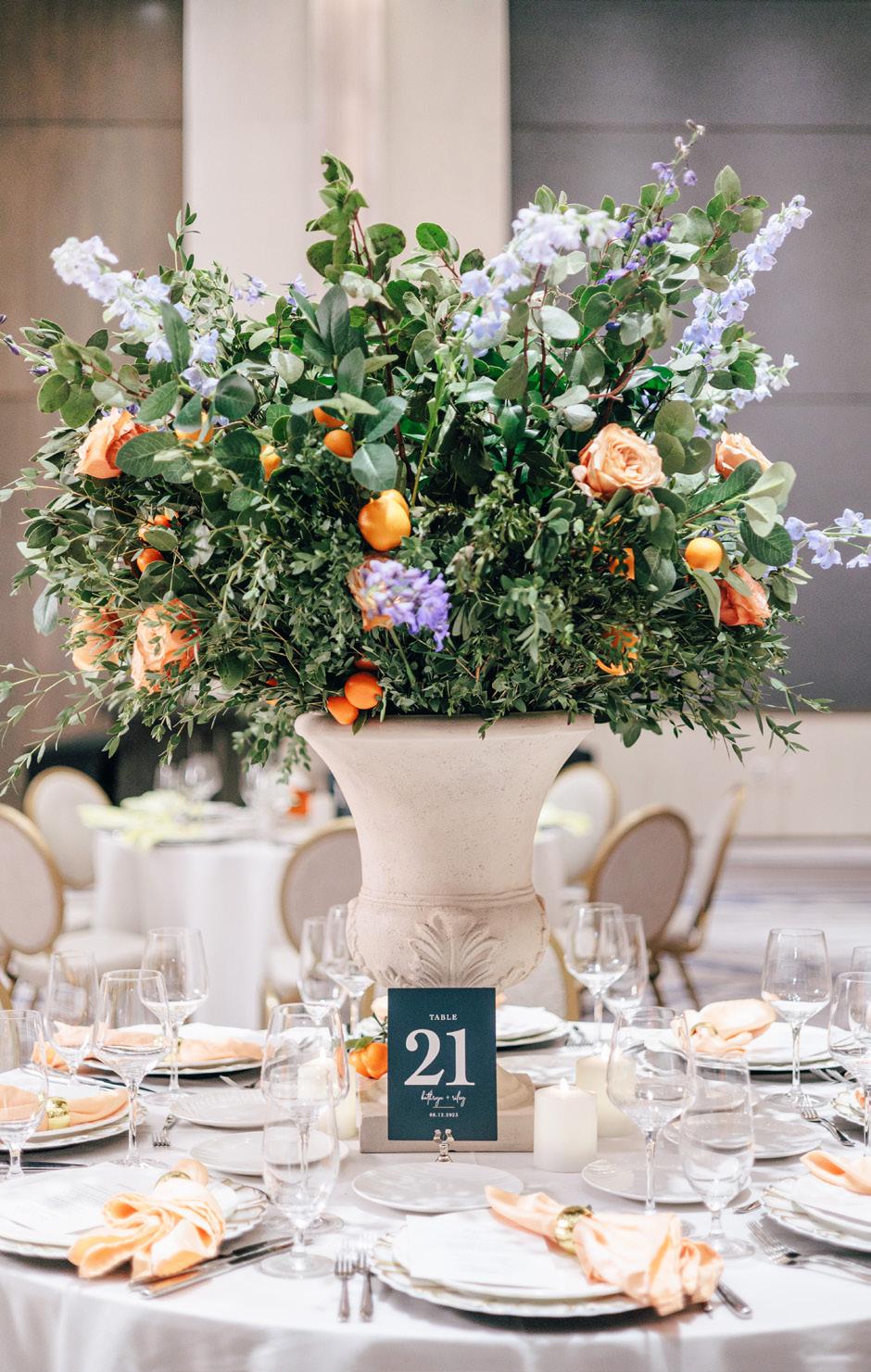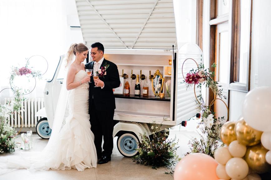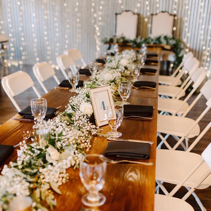 Flora and Flame brought Lauren and Brandon's entire vision to life! While Lauren initially inquired with them regarding their phone booth rental, they ended up providing florals, candles, stationery, signage, custom-built pieces and more. “Flora and Flame Design was one of those meant-tobe moments. While scrolling through New Year’s Eve wedding ideas, I came across a beautiful wedding at Ritz Charles from the year before,” Lauren shares. “After probably hours of Instagram sleuthing, I found Beth and reached out to rent the booth. After just one video chat, I knew she got me. She understood my vision immediately, and her energy was everything we were looking for.”