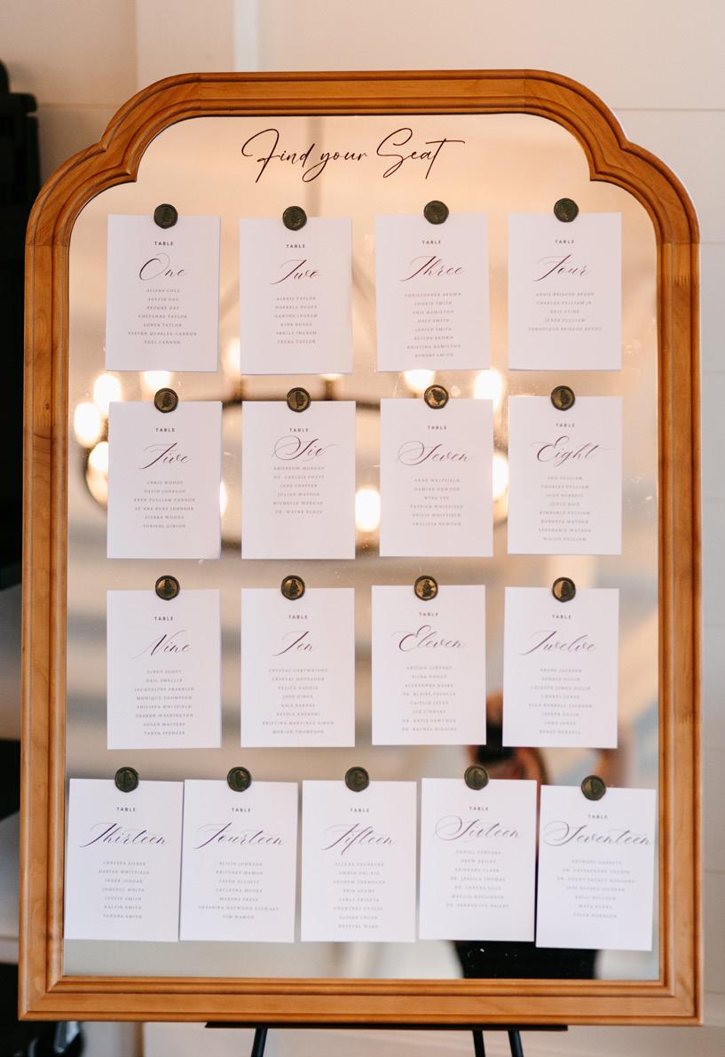 The invitation suite was a stunning display of high-end elegance, featuring timeless design and classic calligraphy that set the tone for this sophisticated celebration. Every element felt intentional and refined, from the gold edges of the menus to the luxurious paper selection. One of our favorite details was the flowing scroll seating chart—a big current trend—that added a dramatic, romantic touch while showcasing the same beautiful calligraphy as the other paper products. It was the perfect blend of tradition and modern-day flair!