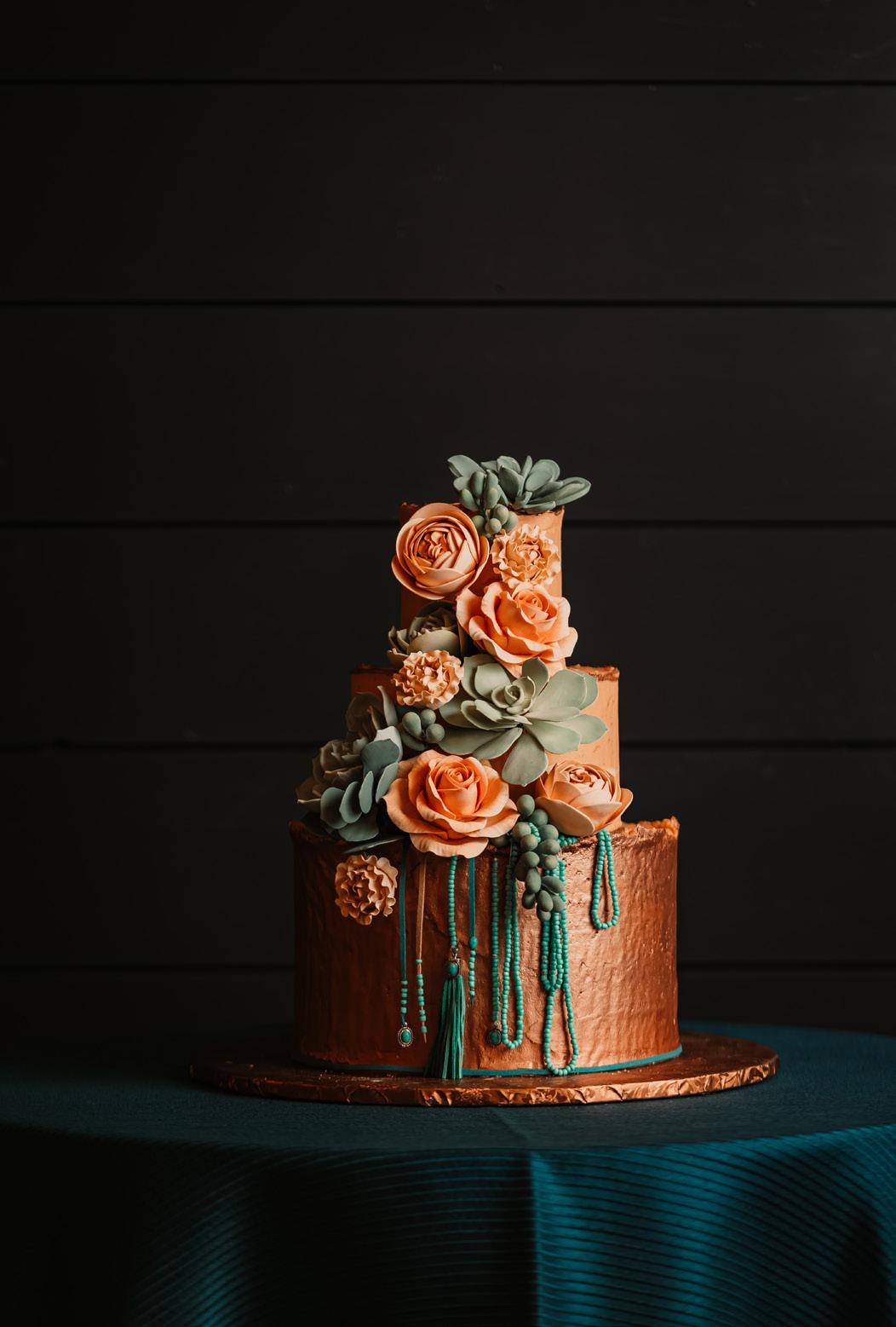 The cake was a stunning blend of rustic charm and elevated elegance. Designed in warm bronze and soft peach tones, the tiered confection featured handcrafted fondant succulents and florals in muted sage and peach. The real show-stealing detail? Delicate turquoise beads that dangled along the bottom tier, adding that quintessential Western flair with a touch of glam. It was the sweetest centerpiece—and a work of art all on its own!