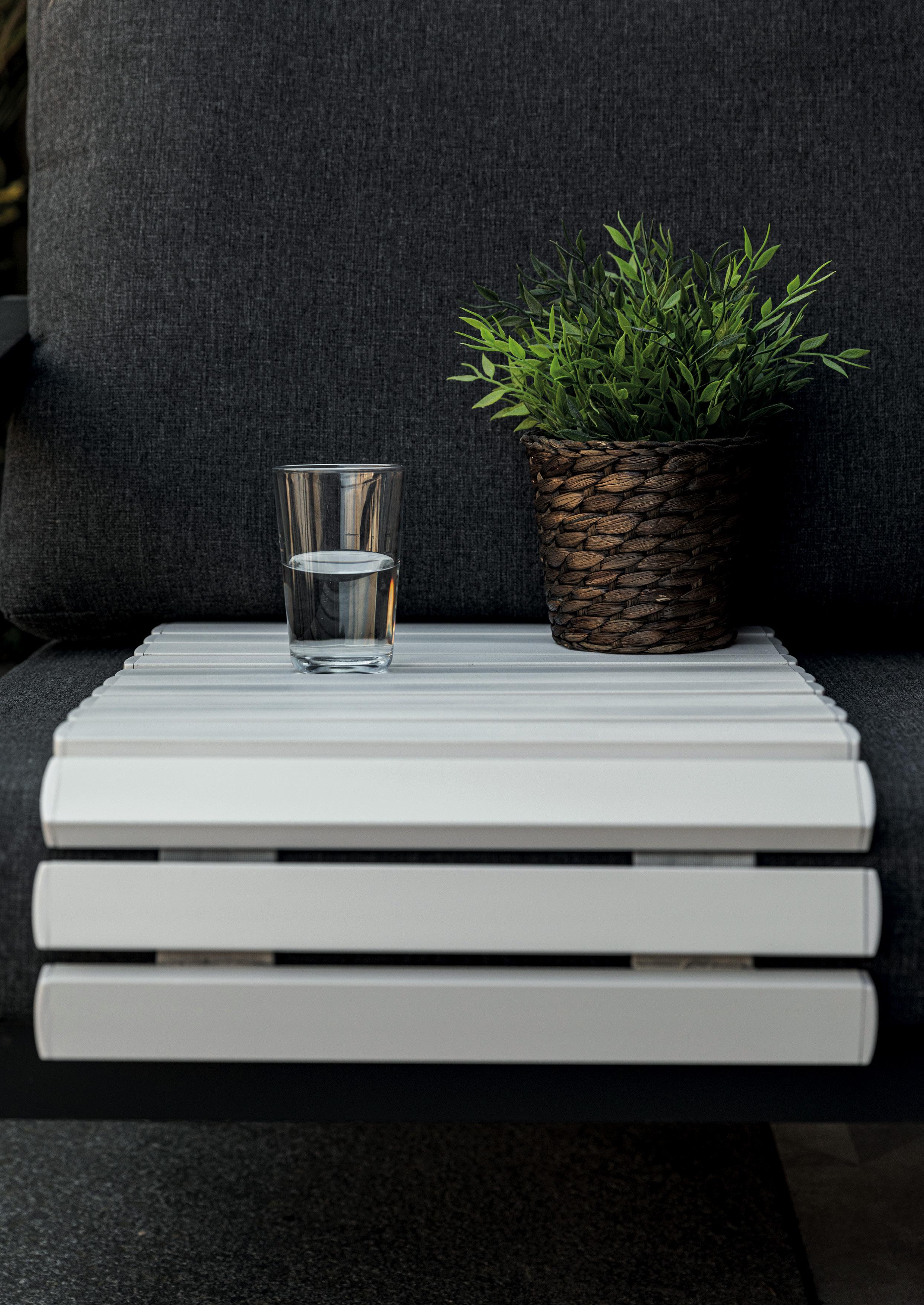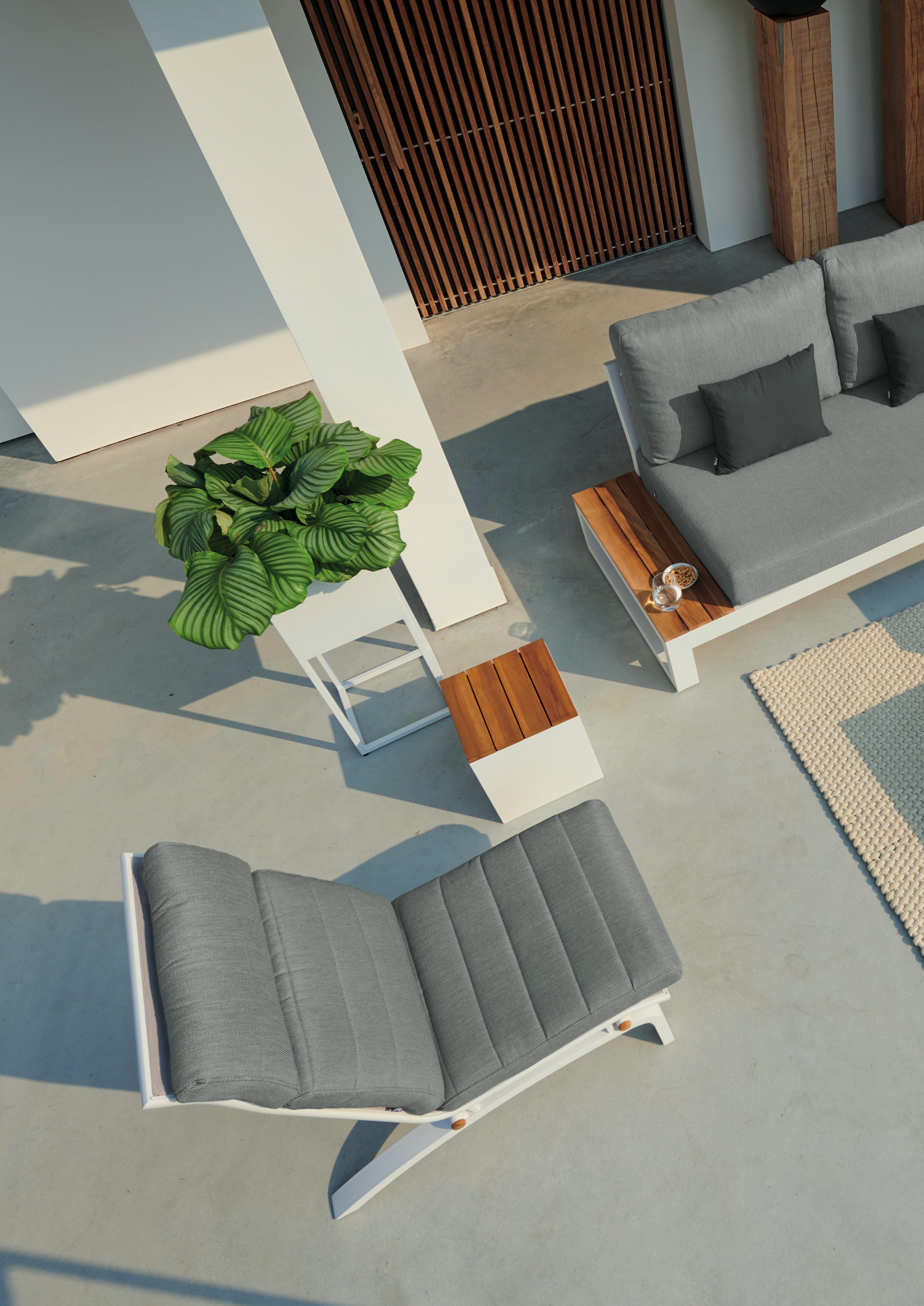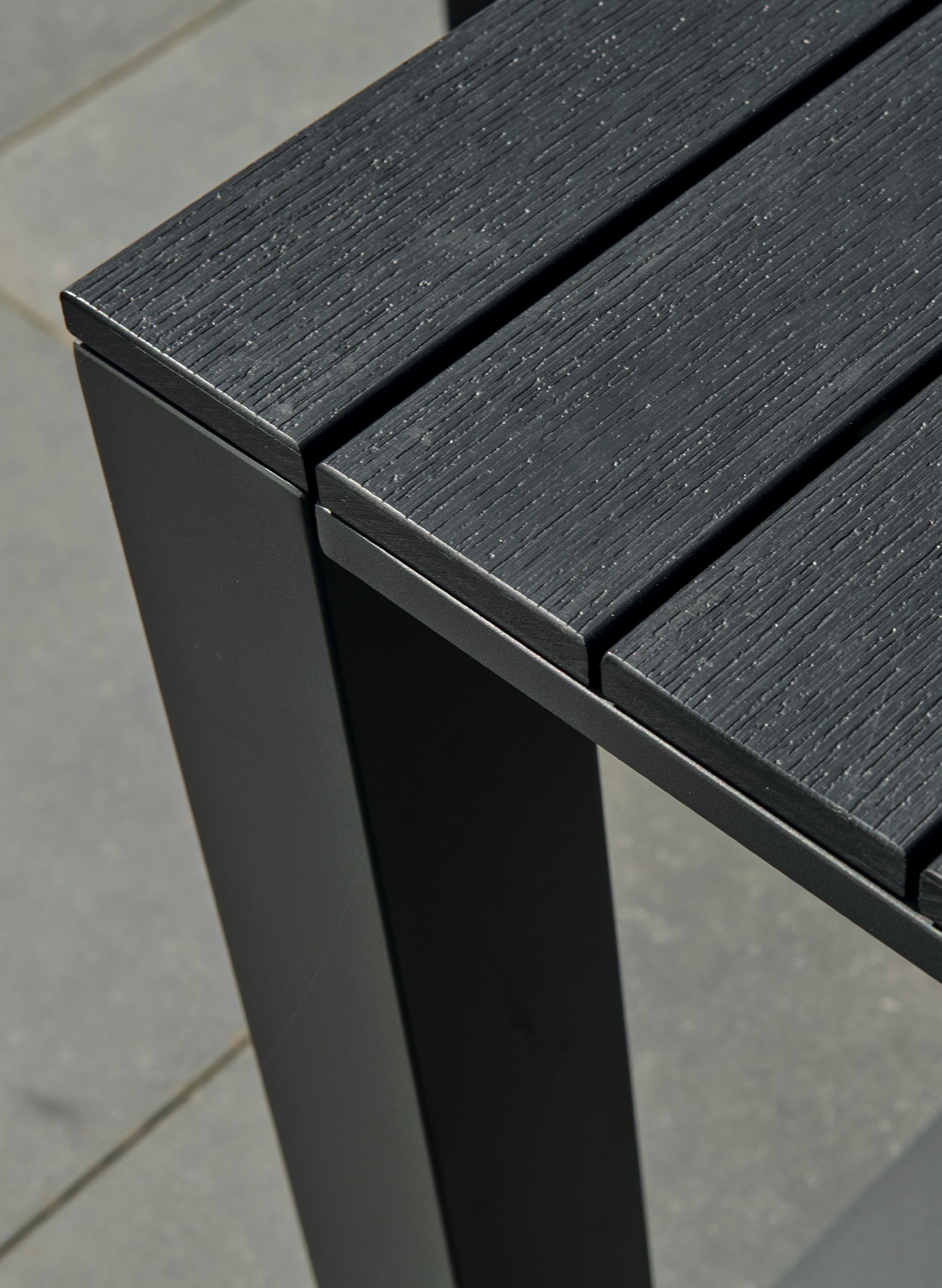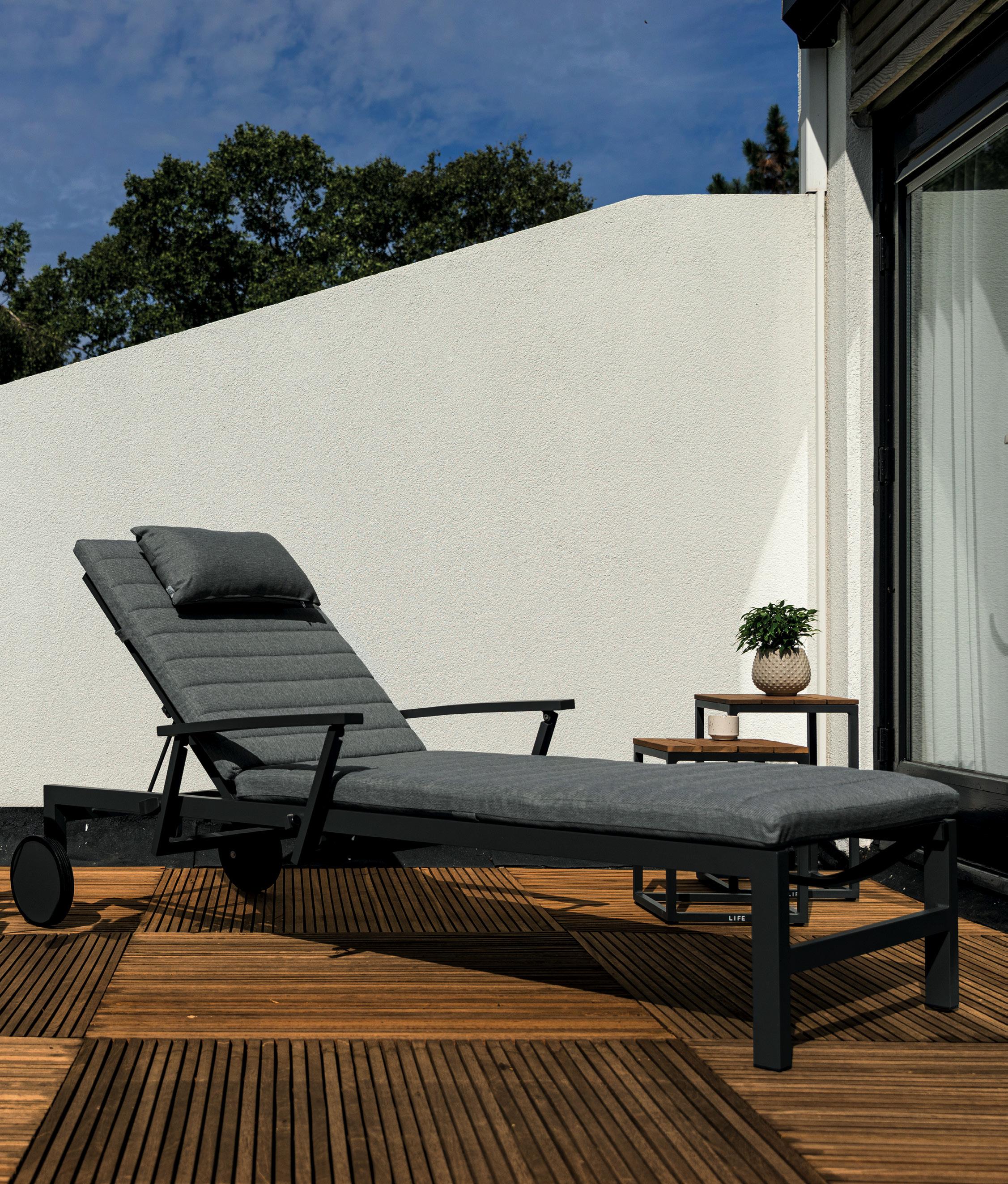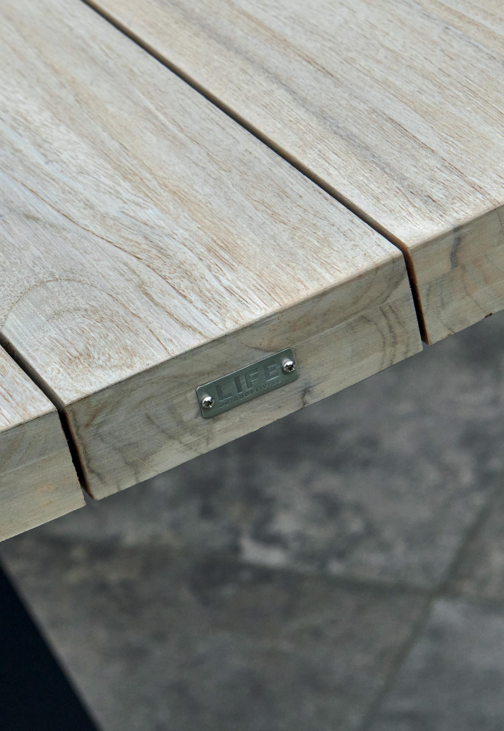 Polywood has the appearance of wood due to its artificial pressed grain and is a sustainable product. You will benefit from its many advantages such as its low maintenance and lightweight. The material is firmly pressed and as a result does not splinter as easily as natural teak wood does. LIFE polywood is available in a pitch black colour combined with a lava frame and fresh light grey colour with white frame.