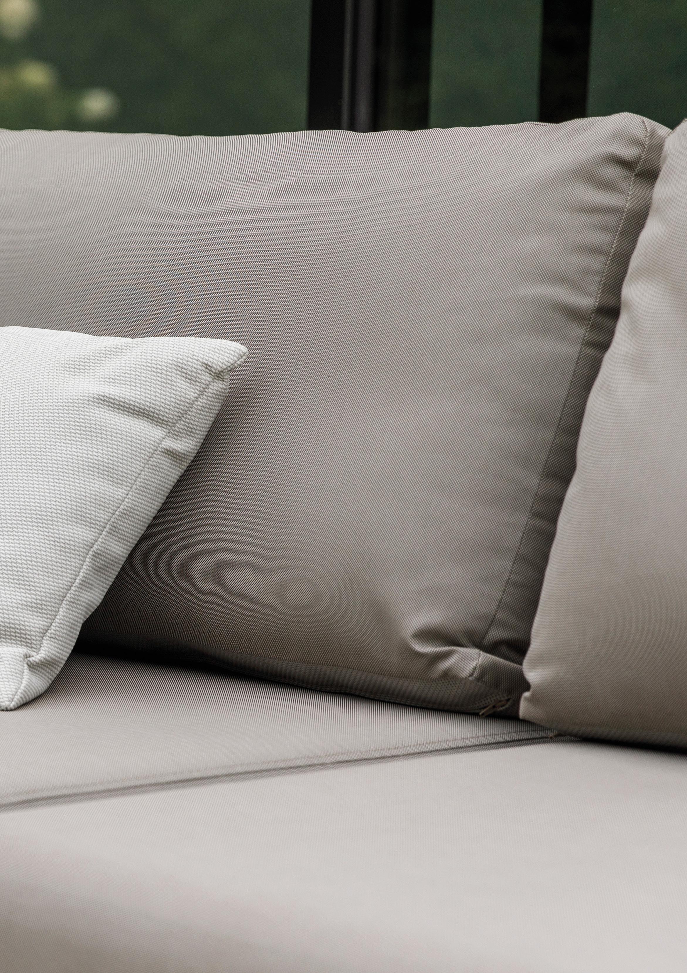 De buitenhoes bestaat uit soft-touch textileen; een comfortabele stof met kleine openingen waar water doorheen loopt. Dit komt in de polyester vulling terecht en loopt, door de open celstructuur, het kussen weer uit. Hierdoor hebben de kussens een kortere droogtijd en kun je na een regenbui weer snel genieten van het zonnetje. Als het kussen nat is, druk dan op het kussen en zet het op de zijkant. Zo loopt het meeste water er al meteen uit en droogt het kussen sneller.