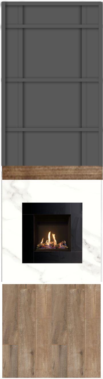 FIREPLACE TILE SURROUND Higher End Contessa Dama Polished 23x23 WOOD MANTEL Special Walnut Stain CLADDING Wainscott Design in SW 7069 Iron Ore FireplaceCladding Inspiration