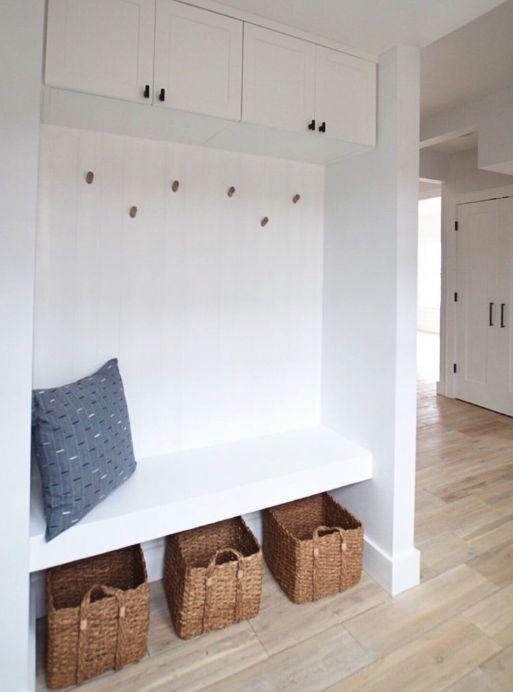 MUDROOM CABINETS Style: Milano Perimeter Color: SW 7006 Extra White Hardware: Halifax Polished Chrome Style Color Inspiration